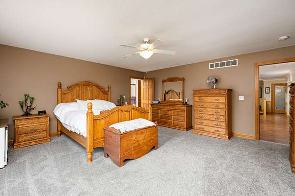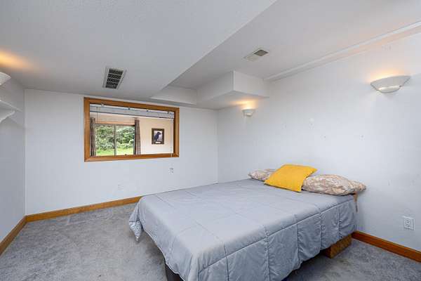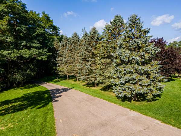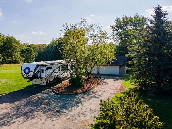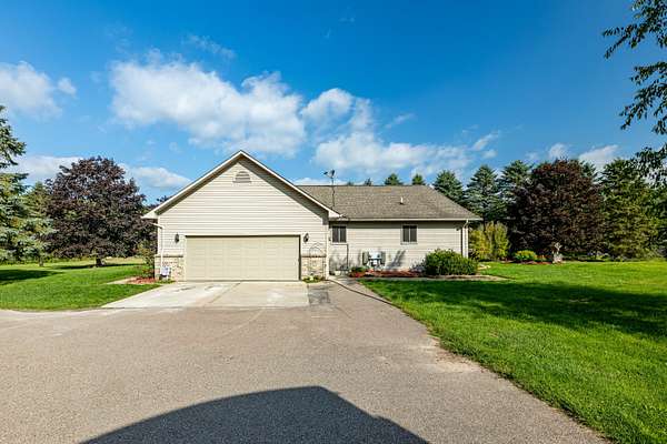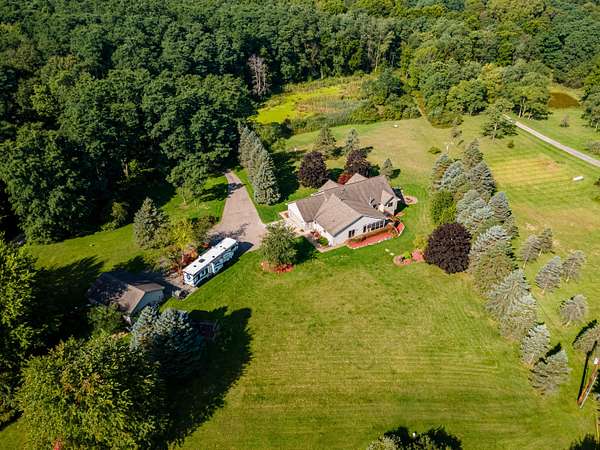 Secluded 4 bedroom/3.5 bath ranch home sitting on 6 acres with a pond. Need space for all your toys? Ample parking and a 2 car attached garage and additional detached 3 car garage. Enter in the the foyer with direct views to the private backyard. The spacious family room features new carpet, new sliding doors, and a fireplace for those chilly nights. The large eat-in kitchen has newer GE profile appliances which feature a dual oven. No shortage on storage with the large walk-in pantry. Primary suite includes new carpet and new sliding door to your own private deck. Double vanities in the en-suite bathroom. Main floor laundry. 1/2 bath for guests. 3 generously sized bedrooms all with natural light through new windows and all with walk-in closets Partially finished walk out basement with additional bedroom/office and full bath. Wet bar and additional fireplace in the recreation room. Foundation is insulated. Home is heated with geothermal. Updates throughout the home.