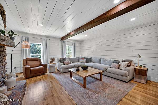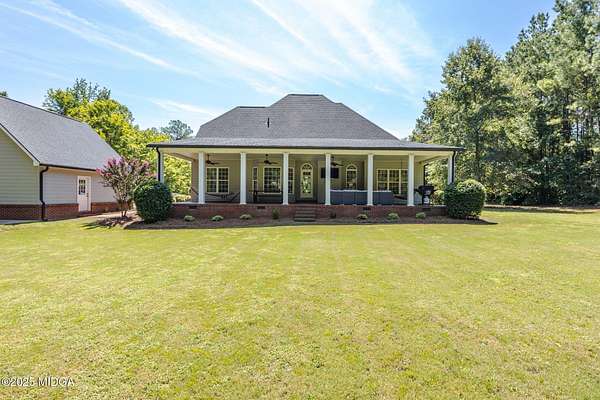 Rustic charm meets modern updates in this beautifully renovated 4-bedroom, 3-bath home on 3.2 private acres in Monroe County. Built in 2004 and thoughtfully upgraded, this property features exposed wood beams, custom trim, and two stunning stone fireplaces that anchor both the great room and spacious den. The open living areas flow into a formal dining space and an updated kitchen complete with a large table-style island, walk-in pantry, and abundant cabinetry--perfect for entertaining and everyday living. The main-level primary suite offers privacy and comfort with an oversized tiled shower and a generous walk-in closet. Upstairs, you'll find secondary bedrooms and a full bath. Step outside to the covered back patio overlooking a flat, private backyard--ideal for outdoor dining or relaxing. A detached garage provides excellent storage or workshop space. Convenient to I-75, this home delivers peaceful acreage living with easy access to Macon or Atlanta. A rare opportunity with space, style, and location!
