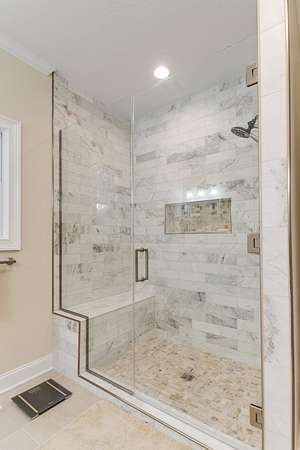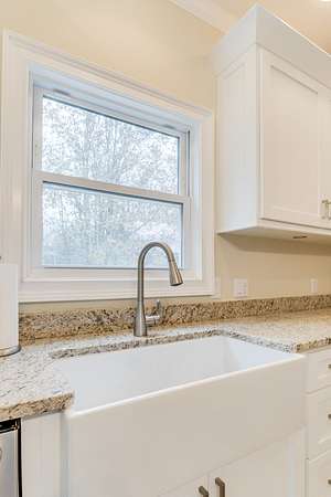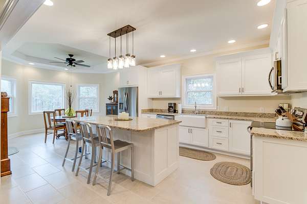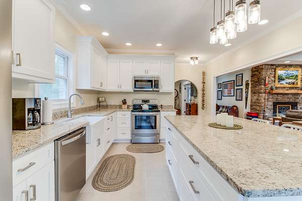The spacious kitchen features custom cabinetry, granite countertops, tile flooring, and upgraded fixtures. Both bathrooms have been fully renovated with granite vanities, new tile, and a spa-style walk-in shower in the primary suite. A large laundry room with built-in cabinetry and a utility sink adds convenience.