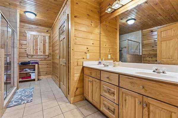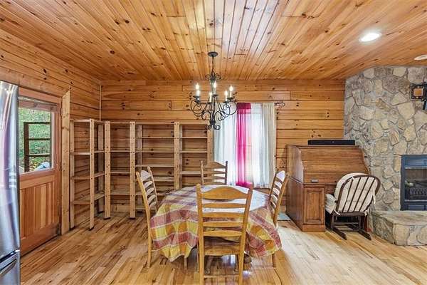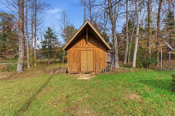 Nestled on 6.7 acres in a serene country setting, this 3-bedroom, 2.5-bath log cabin offers privacy and a peaceful setting. The main level features a warm living room with a stone fireplace, wood finishes throughout, and great natural light. The primary suite is located on the main level for easy accessibility. It features a spa-like bathroom with a separate soaking tub, tiled shower, and spacious walk-in closet. Also on the main level are a convenient half bath and a laundry room. The kitchen opens to the living and dining area for an easy everyday layout. Upstairs are two additional bedrooms, both with walk-in closets, and one bedroom includes its own private ensuite bathroom. Outside, enjoy the covered front porch with stone accents, a covered back porch, raised garden beds, a barn-style workshop, and a separate storage shed. The acreage provides usable yard space near the home with wooded privacy beyond-ideal for those looking for space, quiet, and a true retreat feel.