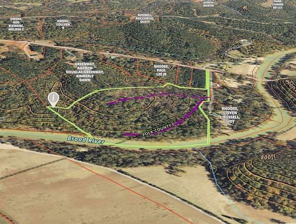 Est $2,973/mo24.1+/- Acres with approximately 1000ft of Broad River frontage! Private access off Poors Ford Rd right on the Rutherford/Polk County line. Follow the cleared trail/proposed driveway up to one of several homesites or turn onto trail that follows the river to where an old self-sufficient cabin sits, that used to be enjoyed by family and friends until Hurricane Helene took it down. No restrictions imposed, so bring your creativity and build your private, waterfront dream get-away. The land was once terraced from the water to the top of the hill it sits on. So many opportunities to choose from. Call Eric or Derek at 828-477-4248 to schedule a showing!
