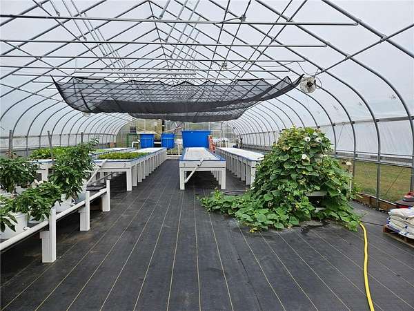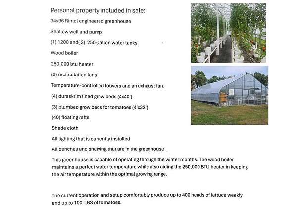 The property includes 2 loafing sheds and a spacious 30x48 pole building perfect for storage, equipment or workshop needs. The large, year-round, fully equipped 34x96 greenhouse is ready for growing. The expansive outdoor garden further enhances production potential. There are 4 wells that conveniently serve this property for the greenhouse, house and garden area.
