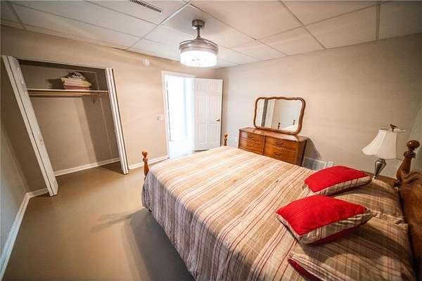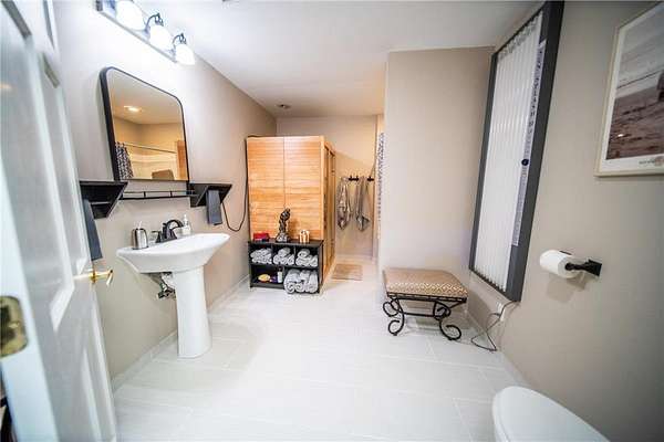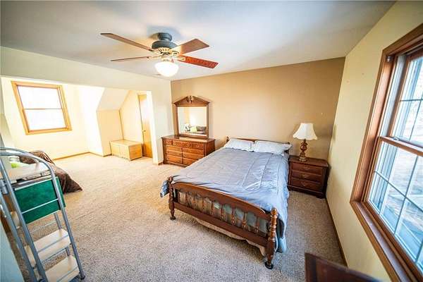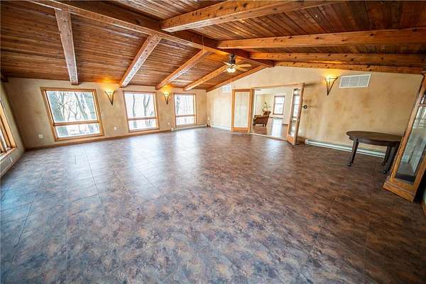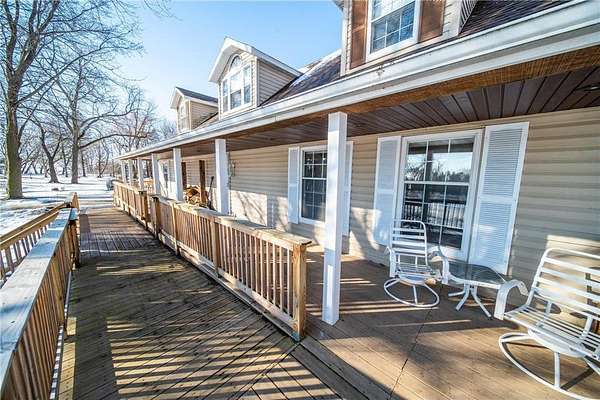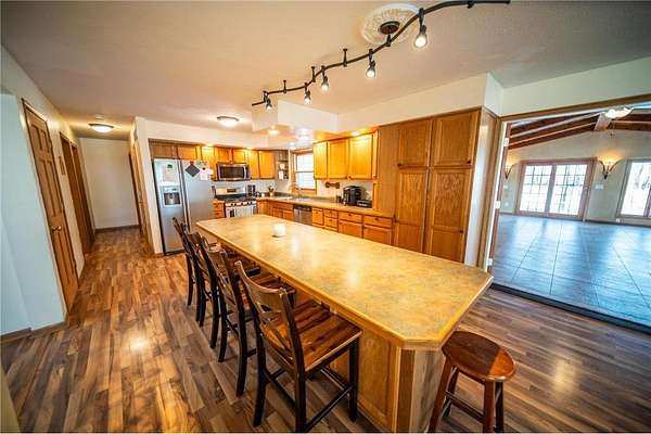 Experience the perfect blend of comfort, accessibility, and space in this exceptional 6-bedroom, 4-bath, over 5,000 sq ft two-story home set on 5 scenic acres. A wheelchair-accessible ramp leads to the front door, offering convenient, step-free entry and thoughtful design from the moment you arrive. Designed for both everyday living and effortless entertaining, the main level welcomes you with LVP flooring, a spacious living room anchored by a charming wood-burning fireplace, and an expansive kitchen offering abundant cabinetry, a generous center island, and stainless steel appliances. The primary suite serves as a serene retreat with its walk-in closet, electric fireplace, and beautifully tiled walk-in shower. A conveniently located half bath and a well-appointed laundry room with a washer and dryer complete the main level. One of the home's most captivating features is the stunning 26x26 sunroom--an inviting sanctuary filled with natural light. With double doors, a gas fireplace, a wood-beamed ceiling, and a patio walkout, this space creates a seamless transition to the outdoors and offers year-round comfort. Upstairs, three spacious bedrooms provide a peaceful escape, complemented by a full bathroom and exceptional storage in the bedrooms as well as two oversized hallway closets. The lower level enhances the home's versatility, featuring epoxy flooring, an electric fireplace, and a home theater setup complete with a movie projector. A full kitchenette with cherry and walnut cabinetry adds flexibility for hosting or multigenerational living. This level also includes a spa-like full bathroom with a two-person sauna and Sun Splash stand-up tanning booth, as well as valuable mechanical updates such as an on-demand water system (2024) and a new 50-gallon water heater (2025). Two additional bedrooms complete this functional and inviting space. An attached 1,044 sq ft garage with a large workbench provides exceptional storage and workspace. Outside, enjoy a beautiful deck with ramp access, a large garden area with 250 gal IBC (Intermediate Bulk Container) tanks, and the peaceful setting only acreage living can provide. This remarkable property offers space, luxury, and flexibility--an ideal retreat in a private, picturesque setting. Schedule your showing today!