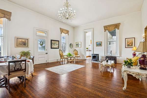 This historical landmark tells of a "bygone era" perched high on the hill overlooking downtown Waverly. Enter into soaring ceilings and an enormous formal living and dining room with a private front porch complete with a swing. The front of the home faces south as it was originally constructed. You can just imagine the extraoridary events that have taken place entertaining in this space. Continue on into what was a "Ladies Parlor" with a fireplace. Next you will enter three large bedrooms each with a bath and fireplace of their own. The length of the east side features a covered porch. In addition there is a "Gentlemen's Room" that is seperate from the house with a fireplace. Legend has it that Jesse James played poker here. The Nolan House was built in 1870 by James Nicholas Nolan, a Civil War veteran who served at Fort Hill. The house is a late 19th-Century vernacular home with Italianate and Queen Anne influences and is listed on the National Registry of Historic Places. The original weatherboard section is embellished with dentil moldings and brackets. The interior contains many original mantels and moldings. Currently the home is entered on the north side of the home through a covered breezeway. On the south side of the breezeway is a completely seperate living area complete with a large room previously used as an additional kitchen. A large bedroom, bath and a sitting room or second bedroom. The kitchen features stainless updated appliances and continues into a laundry room featuring a wall of cabinets and drawers for kitchen storage. The grounds of the home are lovely featuring large level areas for entertaining around the home and boasts 8.7 acres of land. Privacy abounds and so does the widelife with deer that were just visiting. There is a detached Carriage house/garage that was addedd in 2007 24 x 30 with high ceilngs. This home and grounds have been used a private residence, a Bed & Breakfast, and a wedding venue. Let your imagination take over!