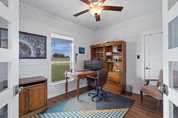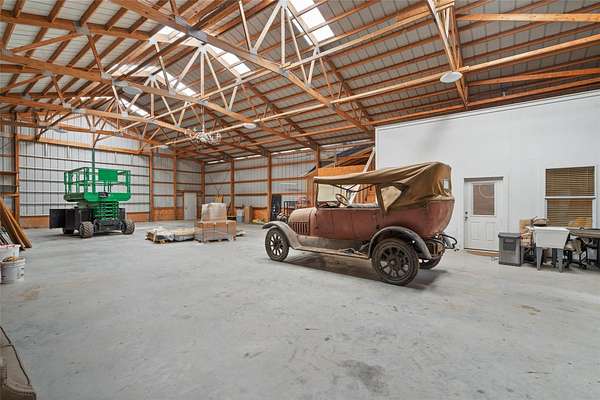 *No restrictions, per title company* For those looking to live life without limits, this one-of-a-kind Hill Country estate offers over 30 acres, a modern farmhouse, a 5-acre pond ideal for livestock, a private guest house, and a massive workshop with its own guest apartment-making it the perfect property for multigenerational living, entrepreneurs, tradespeople, or anyone craving space, flexibility, and freedom. The land is fully fenced and cross-fenced, ready for animals, expansion, or future agricultural use. The 3,121 sqft main home is wrapped in classic split-rail fencing, and thoughtfully designed to embrace the natural beauty of the property. Inside, the open-concept layout is framed by expansive windows, shiplap accents, and a dramatic floor-to-ceiling brick fireplace. The rustic-style kitchen features an exposed brick backsplash, large island with bar seating, stained wood cabinetry with pull-out drawers, a spacious butler's pantry, and a sink window overlooking the rolling landscape. The primary suite includes patio access, a bay window, and an ensuite bath with dual vanities and a walk-in shower with seating. A second bedroom and full bath are on the main floor, along with two flex spaces or home offices with French doors. Upstairs adds even more room to grow with another bedroom, full bath, and large additional living area. Outside, the covered patio and full outdoor kitchen are ideal for entertaining or relaxing while taking in the serene views. A 3-car garage includes one bay that connects to a 622 sqft attached casita featuring a kitchen, living area, bedroom, walk-in closet, and full bath-perfect for guests or extended family. For hobbyists, tradespeople, or business owners, the 3,142 sqft workshop is a dream, and it includes a separate 739 sqft guest apartment with a full kitchen, living room, bedroom, bath, laundry, and oversized utility room. With ample space to add a pool, raise animals, cultivate gardens, or bring your vision to life.