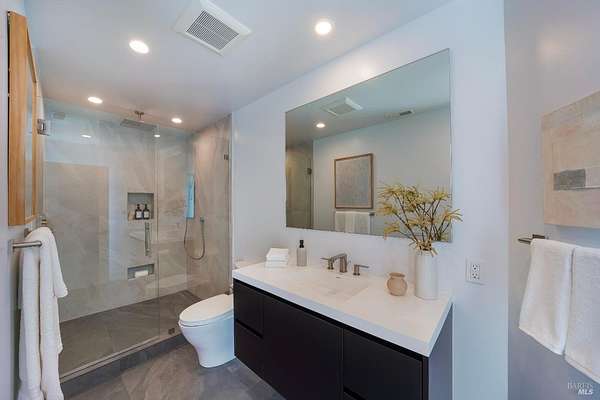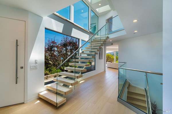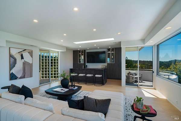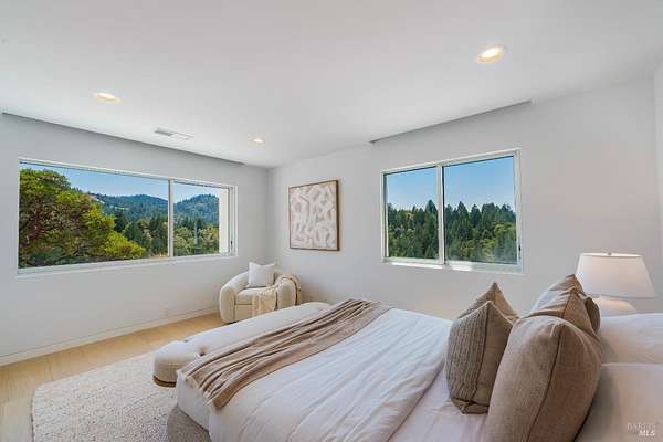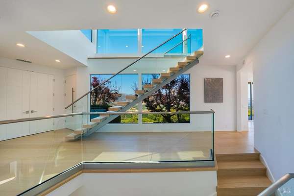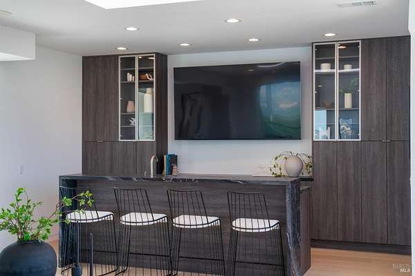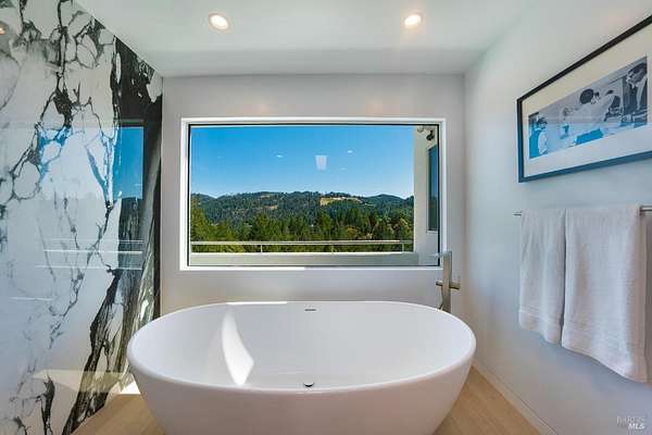 Perched atop Diamond Mountain on 13 private acres, this reimagined coastal modern residence offers exceptional privacy and panoramic views stretching across Calistoga's vineyards to Mount St. Helena and the Palisades. Recently redesigned, the four-level home spans approximately 4,622 sq ft, with soaring ceilings, wide-plank oak floors, and a dramatic open living space anchored by a fireplace and temperature-controlled wine gallery. The kitchen is both sculptural and functional, appointed with a quartz waterfall island and Wolf, Sub-Zero, and Bosch appliances. The primary suite opens to a private balcony and features a spa-like bath and custom dressing room. Additional spaces include a media lounge with wet bar and large-format screen, along with a top-level guest suite positioned for sweeping, elevated views. Outdoor living is integral an architectural round pool and spa*, multiple dining terraces, and a fully equipped outdoor kitchen, all set within a landscape defined by scale, exposure, and uninterrupted sightlines. *Due to the open pool and unguarded edges, the property is best suited for tenants comfortable with a hillside environment. Not recommended for young children.