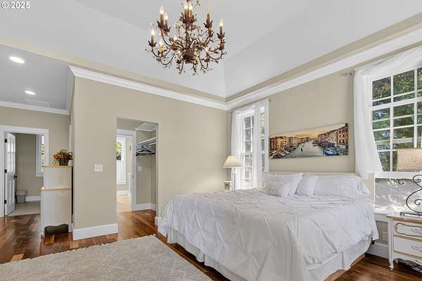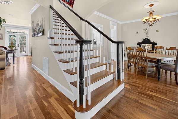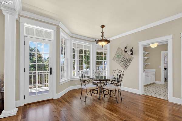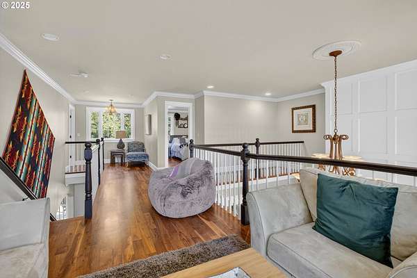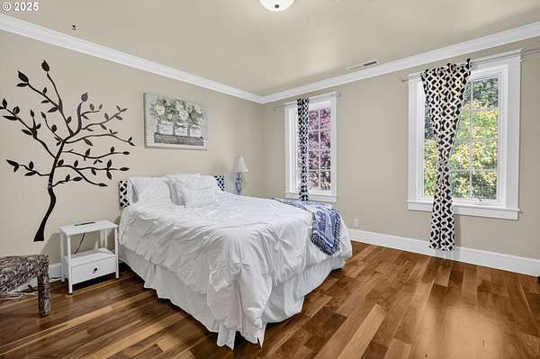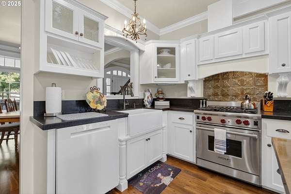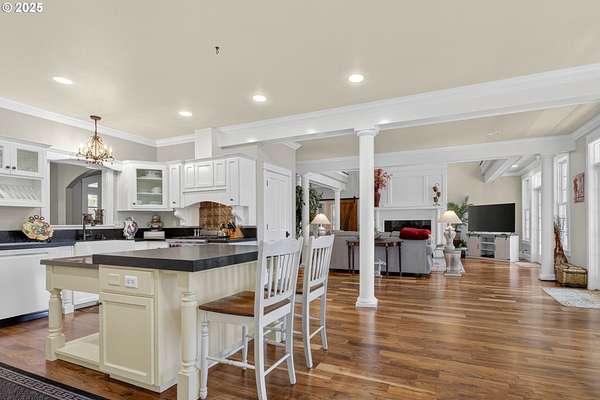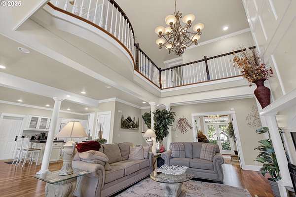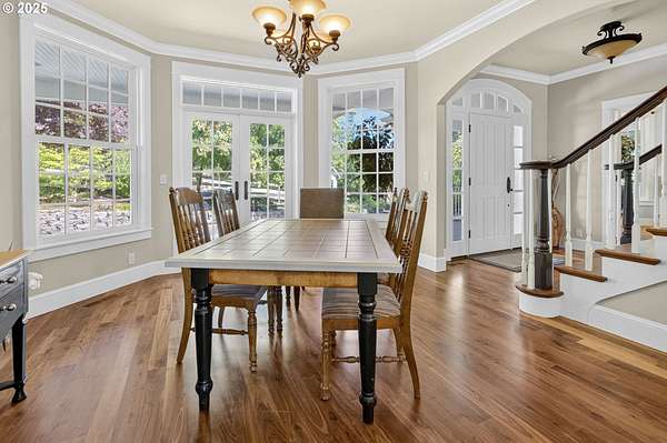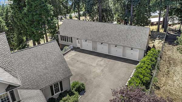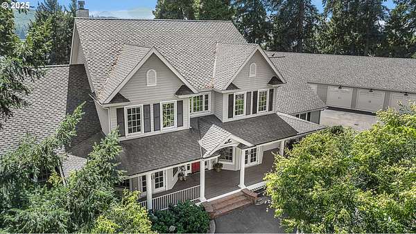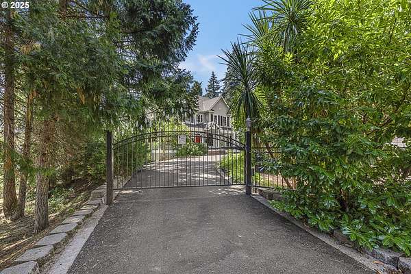 This French inspired hilltop villa features sweeping views of Dexter Lake and the valley below. A successful Airbnb this home is a favorite earning a nearly five-star rating for its beauty, views and convenient location. Private and gated this will truly be your oasis. As you enter note the covered front porch measuring nearly 49X12'. The entry opens to gleaming wood floors, architectural detailing & natural light from the abundant windows. The living room is two story in height yet elegant and beautiful. The chef's kitchen features a Wolf range, large island with breakfast bar and abundant cabinetry. The main level primary bedroom suite is spacious and features private access to the 49X8' rear balcony. Just imagine enjoying your morning coffee and tea on your balcony overlooking the vista below. The walk in closet is ample sized. The primary bath is truly decadent with a huge walk-in tile shower, a jetted tub and dual sinks. This bathroom is exceptionally spacious and reminiscent of a spa. There are three additional bedrooms, a full bathroom, storage room and a family area. The family room space enjoys an open balcony view of the living room below. Outsi you will enjoy two acres of well cared for grounds. The terracing and careful gardening has created a serene space for you to experience. At the rear of the property across the street is the local marina and park on Dexter Lake. Along with the oversized two car attached garage is an incredible shop with three garage bays. This building matches the home in it's design and construction. Enthusiasts will enjoy the heated & insulated space or perhaps a guest suite may be in your future. This villa overlooking Dexter Lake is located just 20 miles from Matthew Knight Arena & approximately 21 miles from the University of Oregon. Very short drive to enjoy this truly pristine hilltop retreat. Wo do not do this home justice. Please view the photos, video and floor plans then schedule a private tour today.