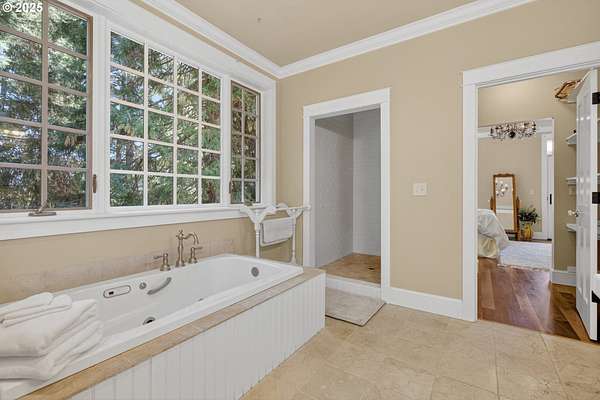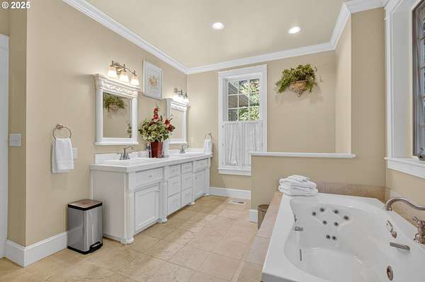 - Ceiling Fan, Garage Door Opener, High Ceilings, Jetted Tub, Laundry, Tile Floor, Wood Floors