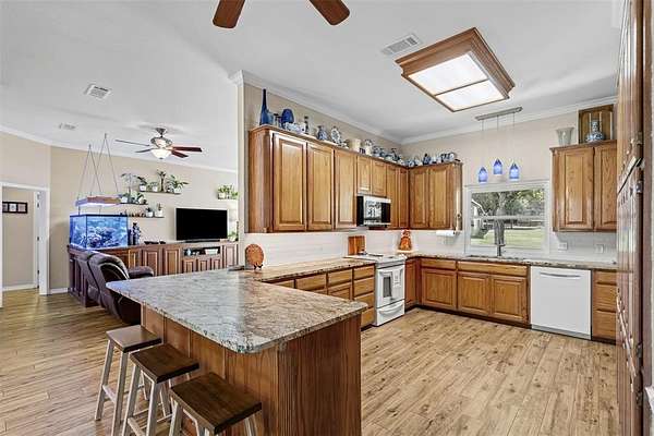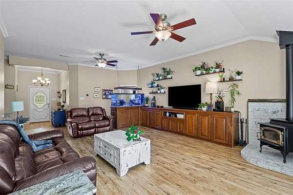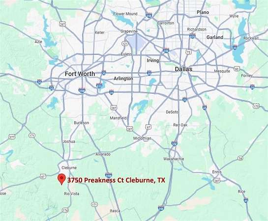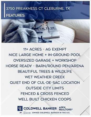An exceptional opportunity awaits at the end of a tranquil cul-de-sac, where country living harmonizes with contemporary conveniences. A true equestrian's dream, featuring pipe fencing, a round pen, horse barn, arena, and loafing shed--well-equipped for all your horse management needs. Need more land? Separate 5-acre parcel available for purchase at additional cost, water and electric available, perfect for a second home to be built or more land for animals to graze. This enchanting 11-acre ranchette boasts a spacious 4 bedroom, 2 and a half bath home that perfectly blends functionality and style. The property includes large chicken coops and a newer workshop, offering endless hobbyist possibilities. Picture mornings sipping coffee on expansive front and back porches or sun room, or evenings tending to sprawling gardens and observing wildlife. Nature's beauty enhances the acreage with a mix of mature trees, a wet weather creek, and multiple fenced areas, maintaining an Ag exemption. Whether exploring the lush grounds or simply enjoying the gentle breeze through the trees, this Cleburne ranchette provides a sanctuary from city life while offering every amenity for modern living. Inside, you'll discover a large family room enriched with built-ins and a cozy wood-burning stove, framed by elegant wood-look tile flooring. The expansive living room, highlighted by new picture windows, offers serene views of the in-ground pool, creating a seamless indoor-outdoor connection. The cook will appreciate the generously-sized kitchen adorned with granite countertops, perfect for entertaining. An at-home office featuring built-ins caters to contemporary work-from-home needs. Designed for privacy, the split bedroom floorplan places the primary suite in its own serene enclave. Recent HVAC upgrades ensure year-round comfort. Experience the allure of country elegance in this picturesque retreat. Schedule your showing today!
