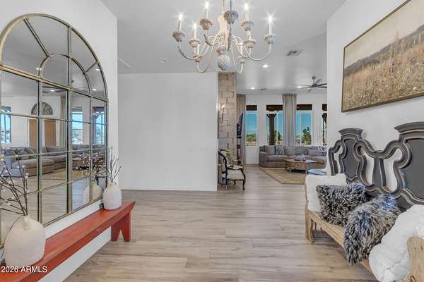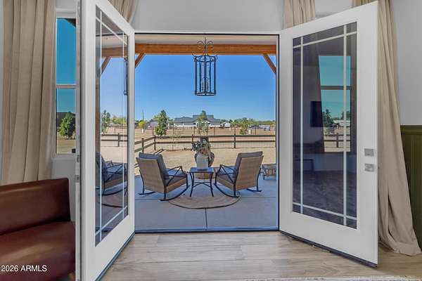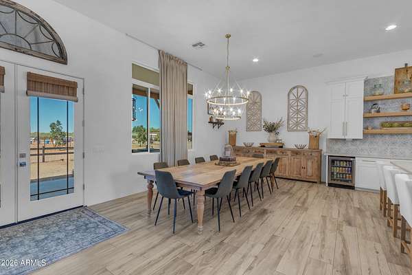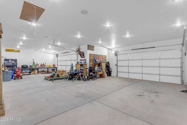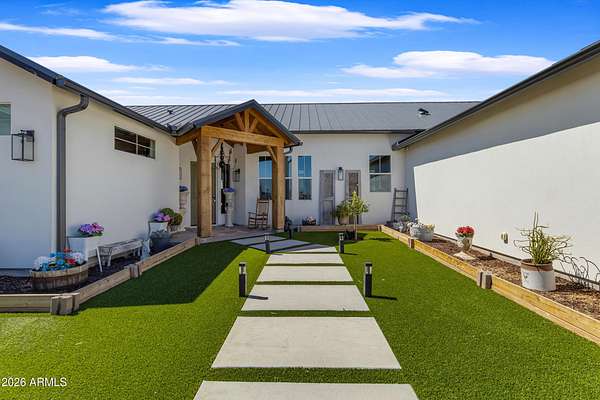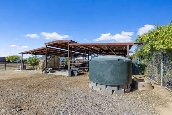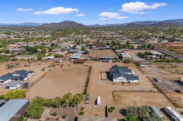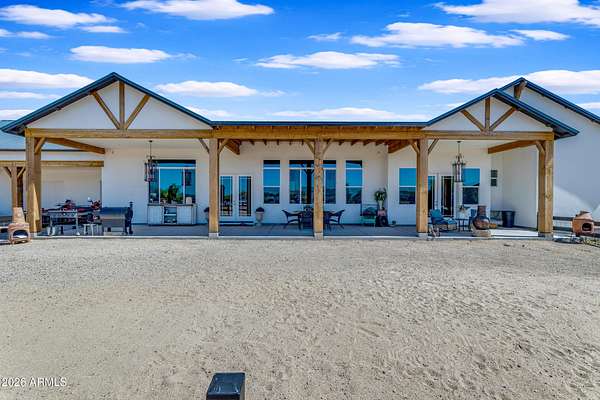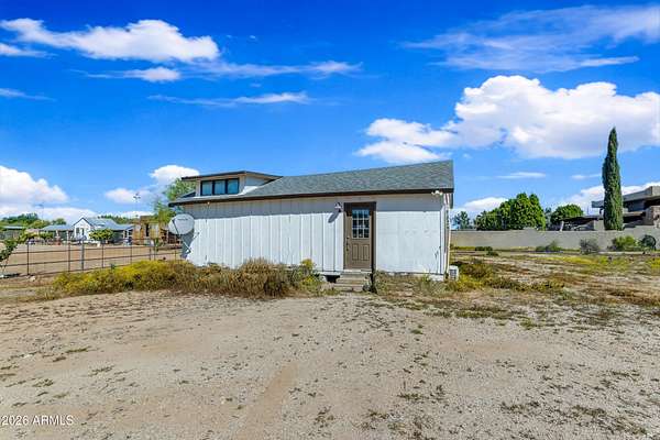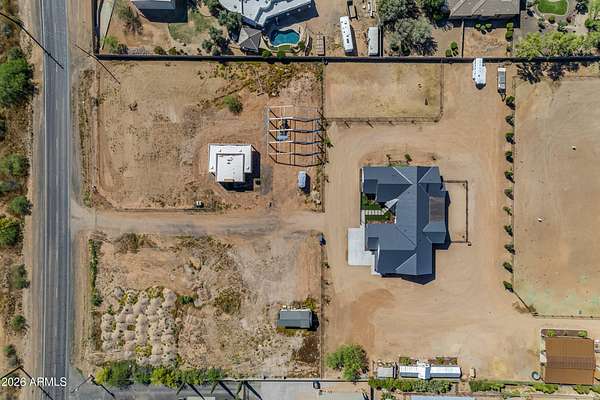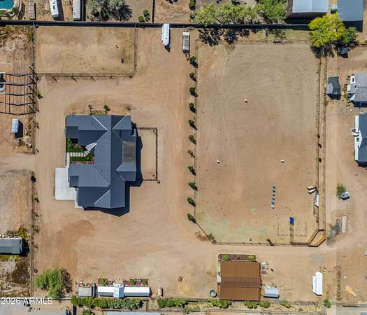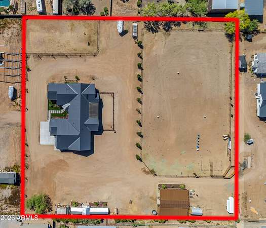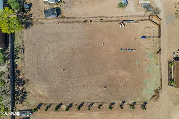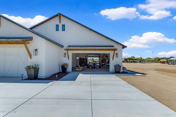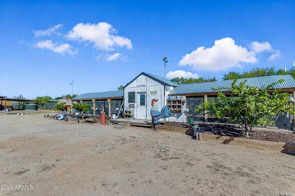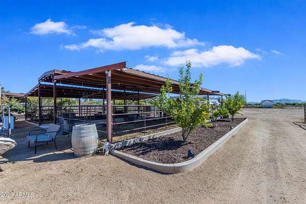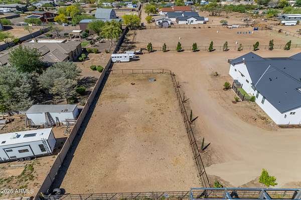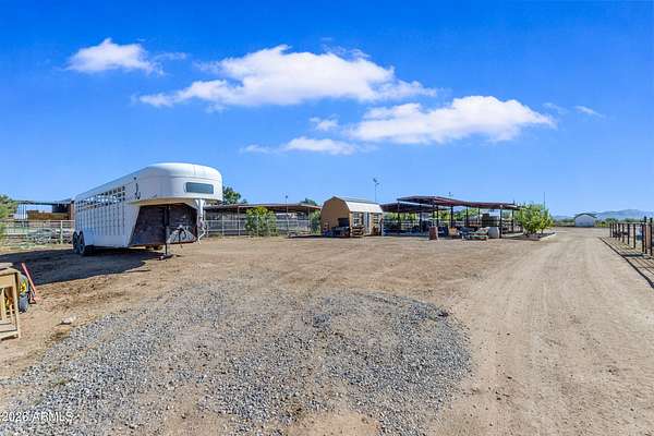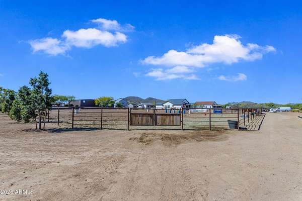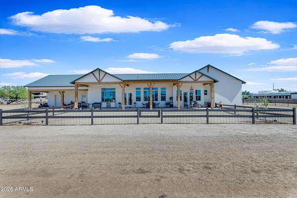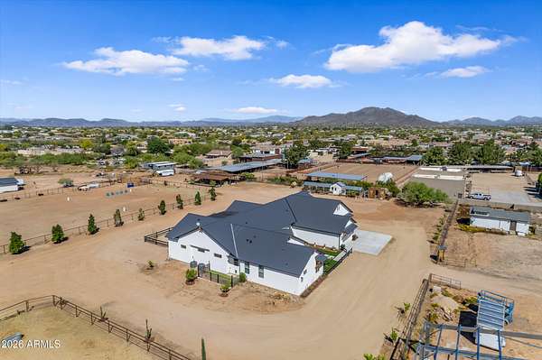 Some properties are just listings... and some you walk onto and immediately know they feel like home. This is one of those. Built in 2022 on 2.99 fully fenced acres, this ~4,000 sq ft custom horse property was designed for the way people actually live--open, functional, and filled with thoughtful, one-of-a-kind details. It perfectly blends a designer dream home interior with a fully dialed-in equestrian setup. Inside, the home showcases a true split floor plan with 3 bedrooms plus a bonus/flex room and 2.5 bathrooms. The primary suite is a true retreat--spacious and inviting--with his & hers walk-in closets and a hidden safe/storage room tucked inside. There's even direct access to the laundry room, which is outfitted for dogs with a secure outdoor dog run--because every detail here was intentionally designed. The living spaces feel open and bright, with large windows bringing in natural light and framing views of the property. Warm wood accents, beautiful flooring, and statement lighting add character and elevate the overall design while still keeping the home comfortable and livable. At the heart of it all is a chef's kitchen built for both everyday living and entertaining--featuring a large island, high-end KitchenAid appliances, custom cabinetry, an appliance garage, a butler's pantry, and a separate prep kitchen that adds both function and style. The garage setup is next level--2,000 sq ft with six-car capacity, tandem pull-through access, its own half bath, and an 8' x 20' structurally engineered attic for additional storage. There's also RV parking with a 30-amp hookup, easy trailer access, and plenty of room to move. Additionally, a 575 sq ft tiny home offers incredible flexibility--perfect for guests, multigenerational living, ranch help, or rental income. There's even potential to purchase an additional acre on a separate bill of sale. For horse enthusiasts, this property is fully set up and ready to go. The grounds feature a 165' x 280' oilfield pipe arena with sand footing, return alley with chute and boxes, a 6-stall breeeway mare motel with 16x16 stalls, multiple turnouts, a tack room, and easy trailer access throughout. It's clean, functional, and thoughtfully laid out for real use. Beyond the horse amenities, the property continues to deliver with 15 fruit trees, a large custom chicken coop, and a 200 sq ft outbuilding complete with power and a mini split--ideal for a workshop, hobby space, or additional storage. Being directly across from Arizona State Trust Land means endless riding right out your gate. Location is just as impressive--centrally positioned with easy access to everything: approximately 45 minutes to Wickenburg, 30 minutes to WestWorld, 20 minutes to Dynamite Arena, and just 10 minutes from I-17. This is a rare opportunity to own a newer custom build with usable acreage, a legitimate horse setup, and flexible living options--all in one. Whether you're looking to live it, work it, or both... this property checks boxes you didn't even know you had. Upgrades to home home C Synthetic stucco C Full spray foam walls and ceilings C Some interior walls sound proof C Pot filler in kitchen C Pot filler at dog station in laundry room C Hard wired for camera exterior C Bluetooth wireless eco bee T-Stats C Bluetooth garage door motors C 2x6 wall construction with full shear entire home C RV plug in C Half hot outlets at the ceiling in the living room, game room, bonus room, office/ every room in the house C Exterior Christmas outlets that are off a switch C 8'x20' structurally built attic storage room in the garage C Hot water recirculating pump C Soft water system through out the home C 90% of the exterior trees irrigated C Gutter in the front of home