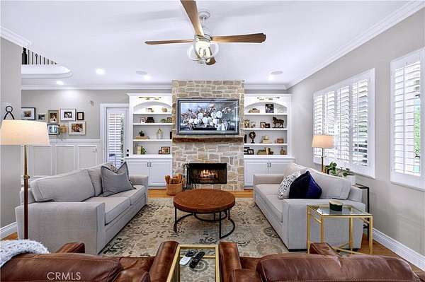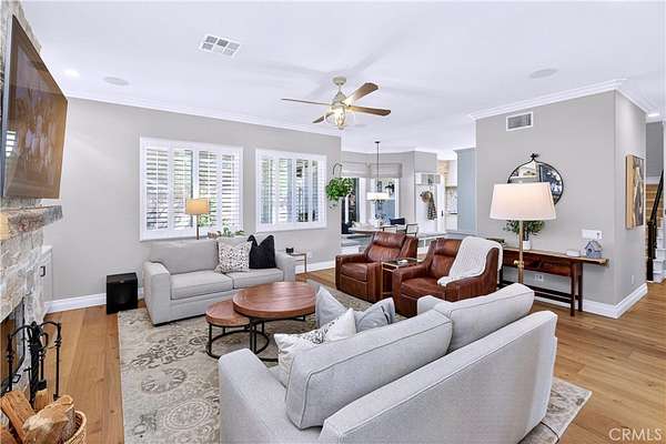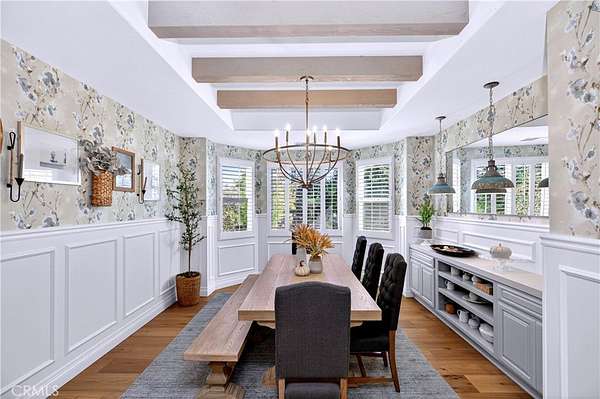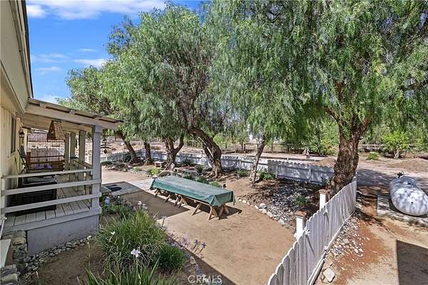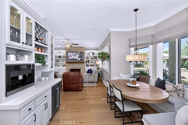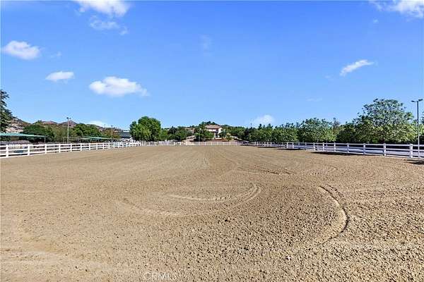 Welcome to Fallen Oak Ranch—an extraordinary equestrian estate perfectly situated in Temecula’s Wine Country, just minutes from award-winning wineries, restaurants, & shopping. The custom-built main residence blends rustic charm with modern sophistication. The designer chef’s kitchen is a showpiece with exposed brick walls, sleek quartz counters, a rich wood-topped island with built-in storage, farmhouse sink, & top-of-the-line stainless appliances including a professional-grade range & oversized refrigerator. Gold hardware, custom cabinetry, & designer lighting create a warm yet refined atmosphere—ideal for entertaining or everyday living. The formal dining room is timeless & inviting with custom wainscoting, soft wallpaper, exposed beams, & a statement chandelier. Natural light pours through plantation shutters onto warm wood floors & a built-in buffet with open shelving—perfect for elegant dinners or festive gatherings. The family room offers relaxed sophistication with a stone fireplace, custom built-ins, & natural light. Plantation shutters, crown molding, & wood floors complete the picture, creating a space that’s both stylish & comfortable.