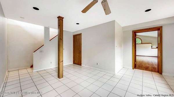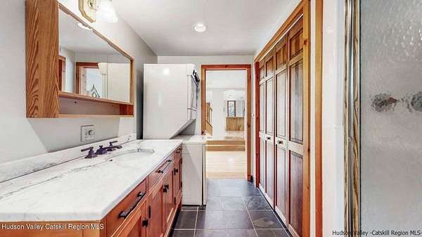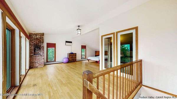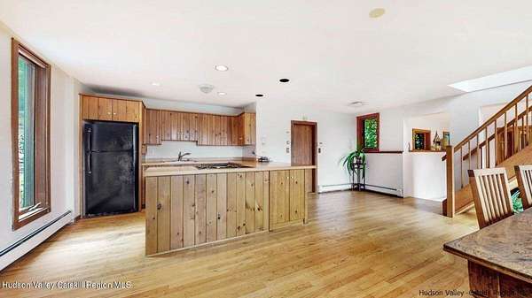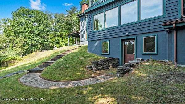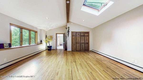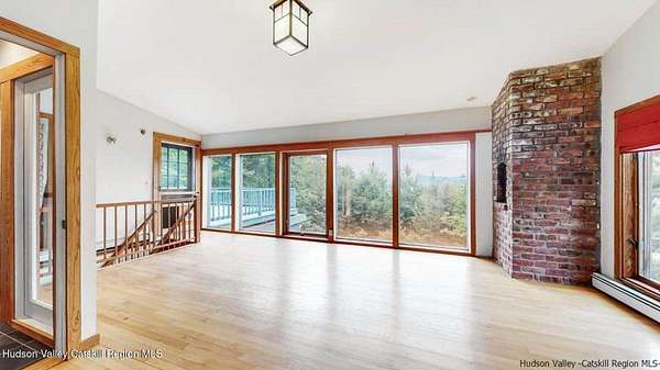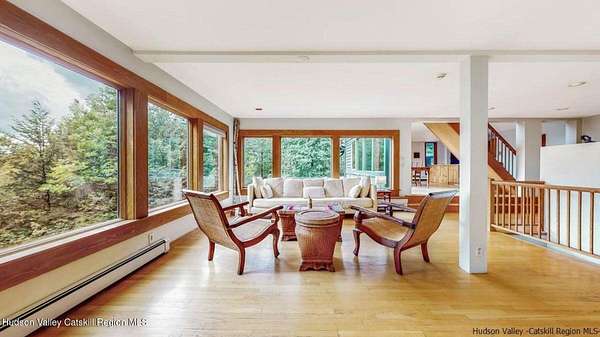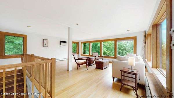 Located on one of Woodstock's most desirable roads sits this classic contemporary set on 5 acres. Privately situated on a town-maintained, dead end lane for that ultimate get-away feeling, this light-filled, two bedroom, two bathroom home with additional flex space, features soaring ceilings with solid wood floors, flooded with natural light from floor-to-ceiling windows. The main living area consists of an open floor plan featuring a kitchen and dining room with wood burning fireplace, living room and full bathroom. A central staircase leads up to the primary bedroom with ensuite bathroom and spectacular mountain views with door leading out to an expansive deck. Have your morning tea or coffee, take an al fresco shower to get your day started, or simply relax and gaze at the mountains. Also from the main living area, take another staircase to the lower level where you will find a capacious additional room featuring a vaulted ceiling and skylights with excellent potential to create additional living or creative space, or a home office.