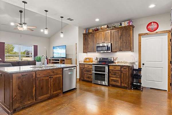 - Decorative Lighting, Eat-In Kitchen, Flat Screen Wiring, Granite Counters, High Speed Internet Available, Kitchen Island, Natural Woodwork, Open Floorplan, Pantry, Vaulted Ceiling(s), Walk-In Closet(s)