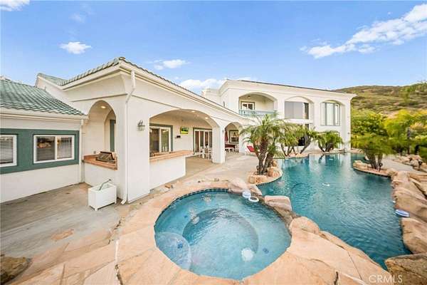 Exquisite Custom Estate with Panoramic Views in Prestigious La Cresta. Discover one of the most extraordinary homes currently available in Murrieta, offering over 6,400 sq ft of refined luxury on more than 5 acres, nestled in the highly coveted La Cresta community. Boasting 4 spacious bedrooms and 4.5 bathrooms, this exceptional property delivers the perfect blend of elegance, comfort, and functionality. Enter through a private, gated driveway to a grand double-door entrance, where you're welcomed by soaring ceilings and a dramatic foyer with rich finishes. The open-concept layout is designed to highlight the sweeping 180-degree views of the Murrieta and Temecula Valleys, visible from nearly every room in the home. Walls of windows and glass doors seamlessly connect the indoor living space to the stunning backyard oasis. Step outside to experience true resort-style living with a sparkling pool and spa, built-in custom BBQ island, and a private guest cabana complete with its own bathroom and shower, ideal for hosting or extended stays. Entertain, relax, and soak in all this property offers. The gourmet chef's kitchen is a culinary masterpiece, complete with high-end stainless steel appliances, granite countertops, custom cabinetry, a large center island with seating, and walk-in pantry. Entertain with ease in the formal living and dining rooms, breakfast nook, and expansive family room, all showcasing incredible views. A fully-equipped custom bar, complete with sink and mini fridge, anchors the impressive game room featuring a billiards table, shuffleboard, and a temperature-controlled wine cellar. Downstairs includes two private ensuite bedrooms, one is currently utilized as a home office with a separate entrance. Upstairs, two additional ensuite bedrooms with walk-in closets. The luxurious primary suite is a true retreat- enjoy sunrises from your private balcony, unwind in the jetted tub, sauna, or massive walk-in shower, and enjoy the expansive walk-in closet with built-in cabinetry and an adjacent private gym. Additional features include an attached 4-car garage with built-in storage, central vacuum system, water softener, security system with cameras, and a solar power system. Set within one of Murrieta's most sought-after communities, this property offers tranquility, privacy, and easy access to top-rated schools, shopping, dining, and the renowned Temecula wine country. This one-of-a-kind estate is a rare opportunity-schedule your private tour today!