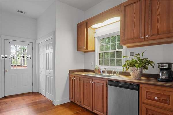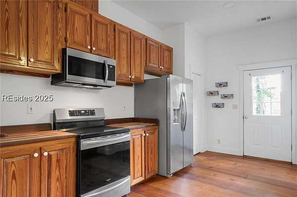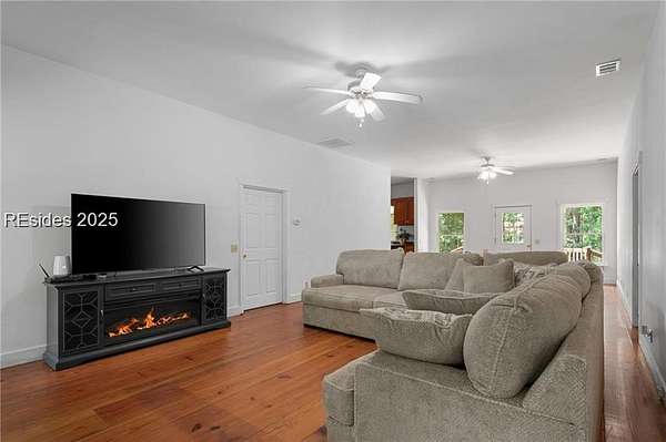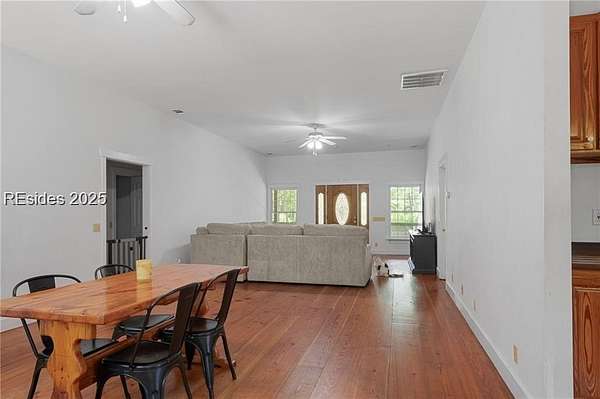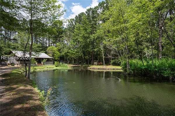 Sitting on 5 acres with a private pond, this inviting 3-bedroom, 2-bath home captures the best of Lowcountry living - peaceful, private, and free from HOA restrictions. Inside, you'll find a well-planned layout with 10-foot ceilings, spacious bedrooms, and an inviting open living area that connects effortlessly to a functional kitchen perfect for everyday comfort or entertaining. The home showcases handcrafted heart-of-pine floors and cabinetry, complemented by butcher block countertops for a timeless, warm aesthetic. Thoughtful upgrades include dual-zone heating and cooling for the secondary bedrooms, an oversized 80-gallon water heater, and a 100-gallon well tank for added convenience. A newly installed well and pump provide dependable water access. Ideally located just minutes from Ridgeland and a short drive to Bluffton and Beaufort, this property blends privacy, charm, and accessibility in a truly special setting.