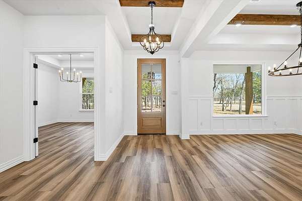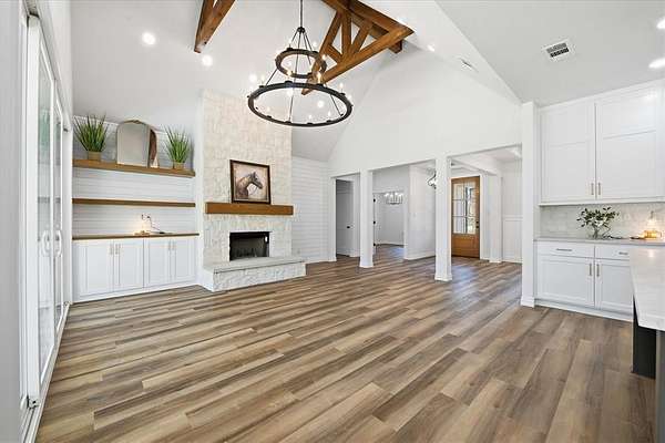 Inside, you’re welcomed by vaulted ceilings, a statement light fixture, and an open, airy layout. The living room is filled with natural light and features a cozy fireplace, built-ins, and beautiful views of the wooded acreage.