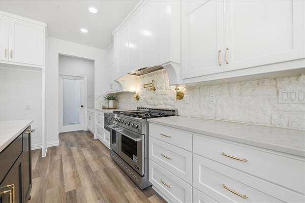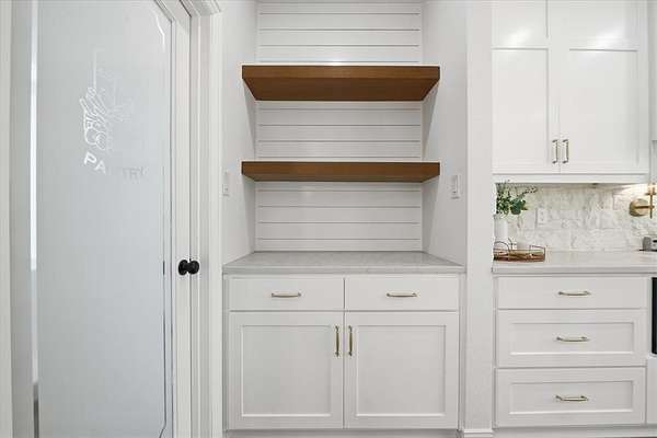 The kitchen is a standout with quartz countertops, oversized island, breakfast bar, built-in microwave, Butler’s pantry, and a large walk-in pantry. The bright eat-in area is perfect for everyday living or entertaining.