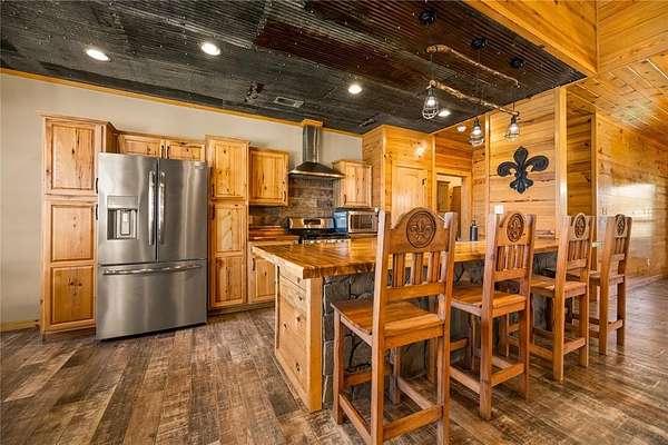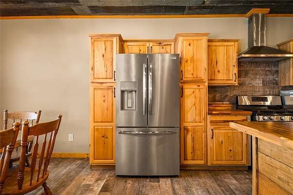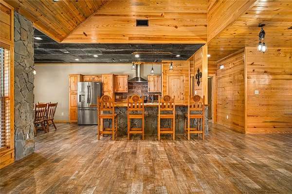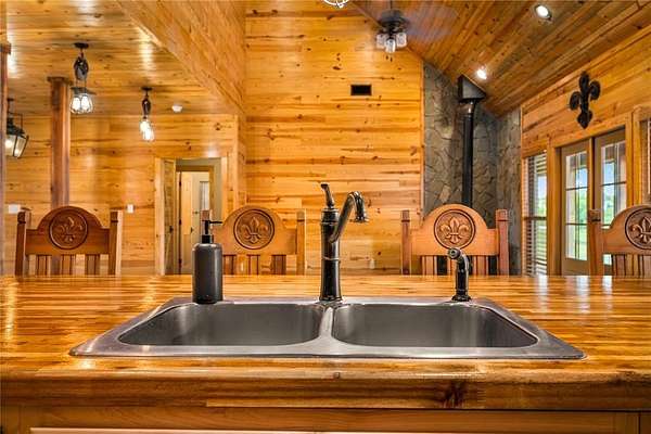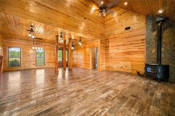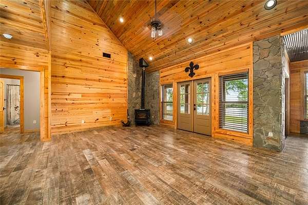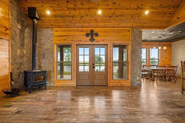 The home features a durable cypress wood exterior, well-suited for waterfront living with natural resistance to moisture, insects, and the elements. Inside, you’ll find an open living and kitchen layout with good natural light and water views, along with an upgraded wood-burning stove with stone surround that can efficiently heat the home.