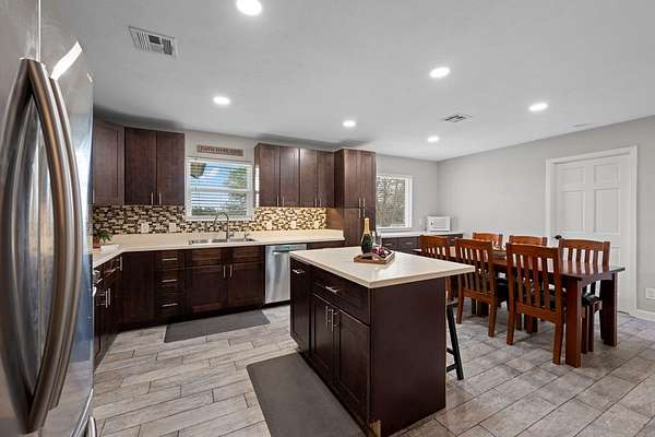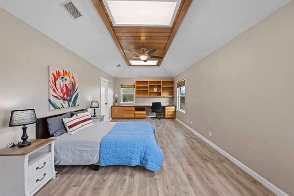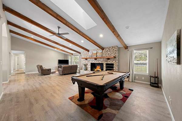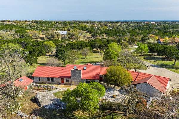 Set on 7.21 park-like acres in scenic Tierra Linda Ranch, this inviting 3,032 sqft home offers privacy, open skies, and a lifestyle centered on nature and recreation. The split floor plan includes 3 bedrooms and 2.5 baths, anchored by a spacious living room with a stone fireplace and skylights that bring in natural light. The large kitchen features ample cabinetry and a dining area, ideal for daily living and entertaining. The primary suite offers a retreat with double sinks, walk-down shower, and walk-in closet, plus a cedar-lined closet nearby for added storage. A dedicated office, generous laundry, and a secondary bedroom with built-in shelving and desk space add flexibility. Outside, enjoy a private fenced yard with a rock patio and multiple seating areas, perfect for relaxing or spotting wildlife. Amenities include two private lakes, pool, pickleball and tennis courts, horseback riding, plus a private airstrip and hangars. With an agricultural exemption in place, this property offers authentic Hill Country living.