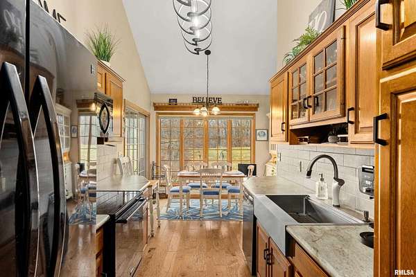 Rare opportunity to own this stunning custom-built ranch on 3.62 private wooded acres! This beautiful home features three bedrooms, including a spacious primary suite with en suite bath. A main floor office/den with a beautiful view and access to the covered patio makes working from home a dream! Vaulted ceilings and large windows fill the home with natural light while showcasing gorgeous views of the surrounding property. Step outside to enjoy the covered composite deck overlooking the peaceful wooded setting , plus a custom paver patio-perfect for relaxing or entertaining! The finished walkout basement offers even more living space with a family room with fireplace, kitchenette, additional bedroom, and full bath-perfect for guests or extended living. The walkout lower level opens to the peaceful wooded setting, creating a private retreat that's truly hard to find.