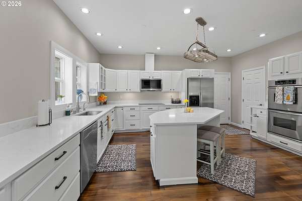 - Cooktop, Dishwasher, Disposal, Double Oven, Free Standing Refrigerator, Island, Microwave, Pantry, Plumbed For Ice Maker, Quartz, Stainless Steel Appliance