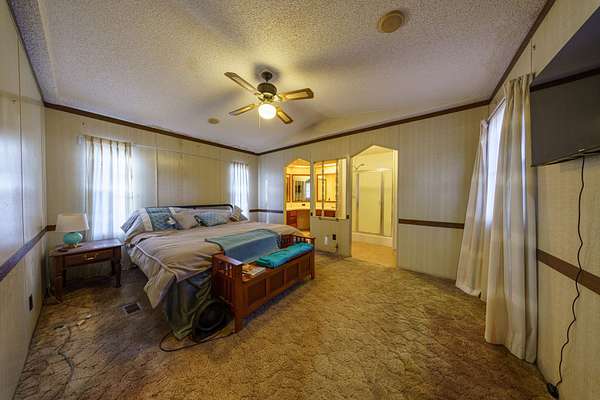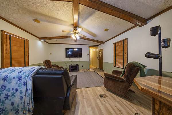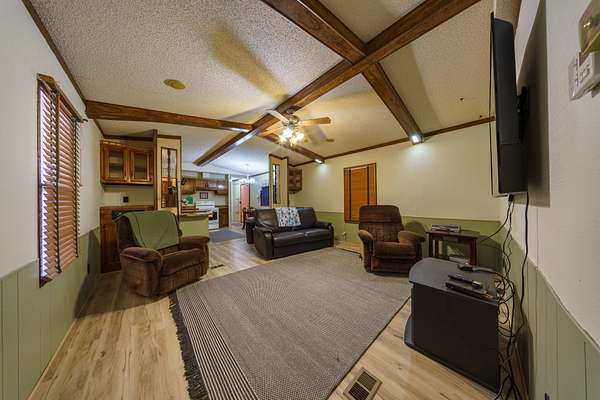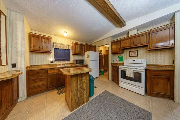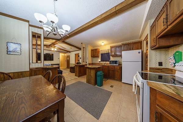 The mobile home has been updated by the current owners and is move-in ready. Improvements include a new Coleman furnace, new appliances at the time of purchase (all appliances convey), and roofing repairs, with portions of the roof being newer. The home is served by a 151 +/- foot-deep well, and the seller will install a new pressure tank for the water system prior to closing. County water is available at the road should a future owner wish to connect.