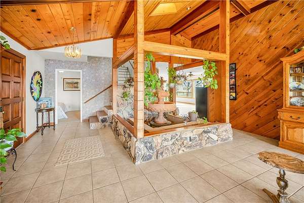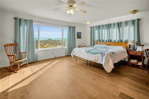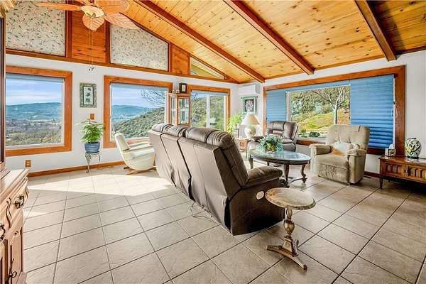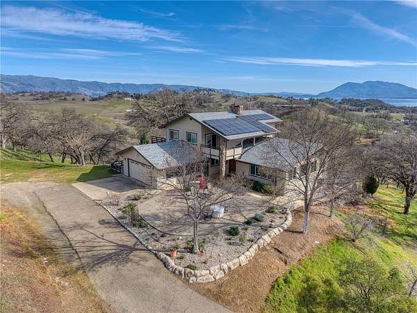 Perched high above the Lakeport Valley, this one-of-a-kind Northern California retreat captures sweeping, unobstructed views of Clear Lake and the surrounding countryside. Set on 18 private acres, the property blends timeless architecture, thoughtful upgrades, and serene outdoor living where wide-open skies and peaceful surroundings set the tone. The home welcomes you with a beautifully hardscaped courtyard-style patio, leading into a warm and inviting interior defined by vaulted wood-plank ceilings, exposed beams, and rich natural finishes throughout. A striking atrium-style interior planter with stone accents serves as a stunning architectural focal point, filling the home with natural light and a seamless connection to the outdoors. The residence has been fully updated and offers a versatile floor plan with a downstairs bedroom and bath, plus three additional bedrooms and two bathrooms upstairs. A radiant-heated main floor provides a cozy living space and is enhanced by wood stoves, while the upstairs primary suite features a wood-burning fireplace, creating a peaceful sanctuary with views stretching across the valley and lake. Step outside onto the Trex wrap-around decking or unwind on the hot tub deck overlooking Clear Lake, offering a true front-row seat to unforgettable sunsets and star-filled nights. Notable upgrades include a new roof, owned solar, and a private well, delivering comfort, efficiency, and peace of mind. The property is complete with a large attached two-car garage, shop/barn, multiple outdoor patio areas, and established garden beds, offering space to live, create, and explore. This is more than a home it's a lifestyle of privacy, craftsmanship, and connection to nature, with some of the most breathtaking views Lake County has to offer.