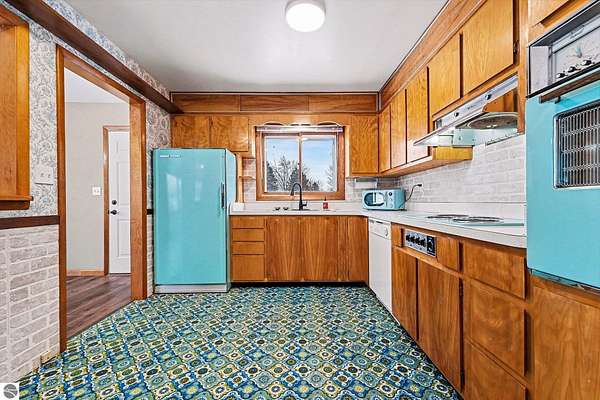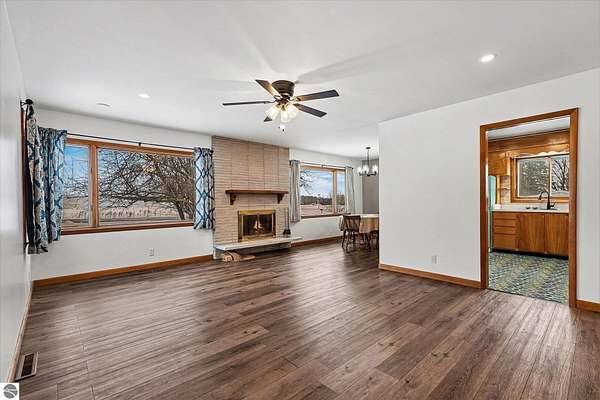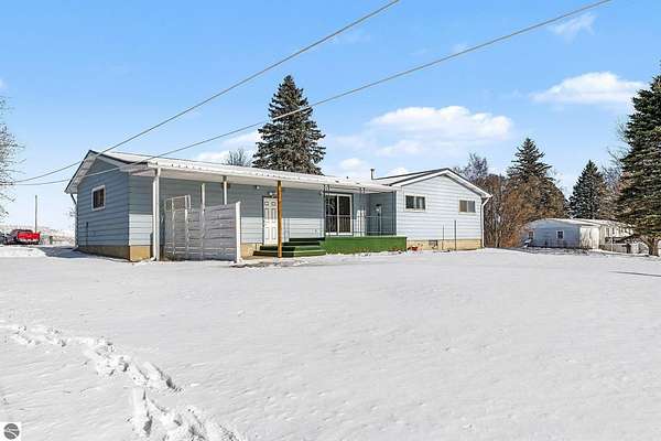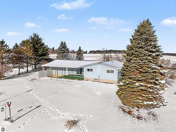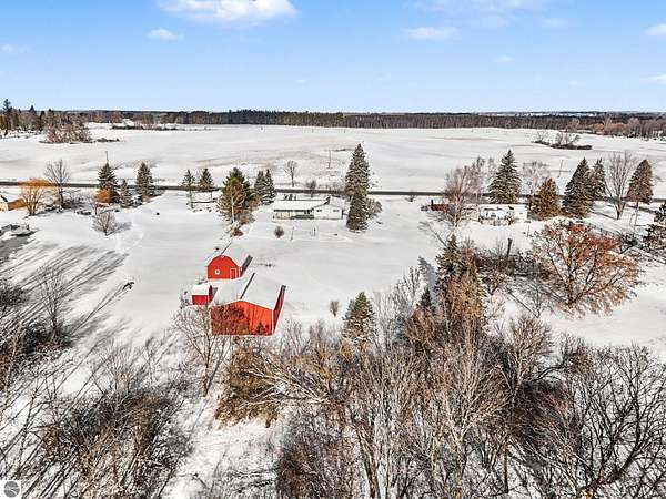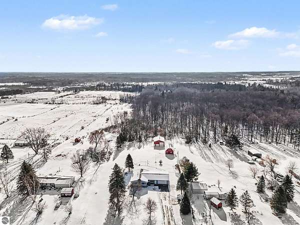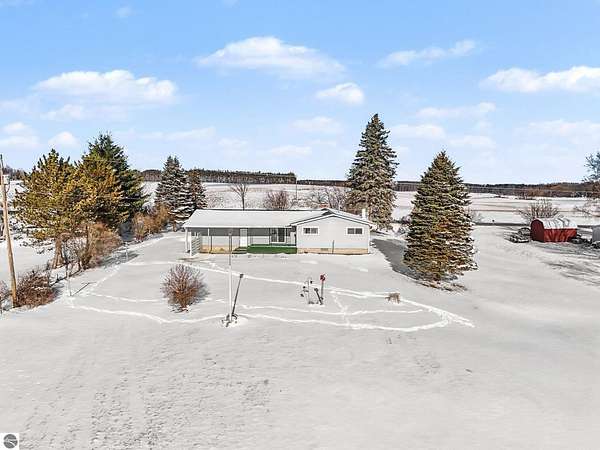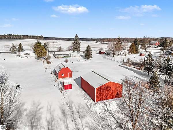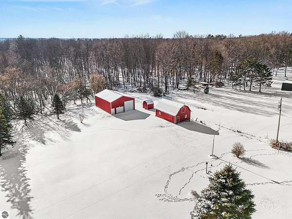 Serene, peaceful 5 acre homestead (with 3 charming outbuildings) offers picturesque country living, while close to a quaint town. This well maintained ranch style home includes an attached garage, paved driveway, open floor plan, main floor laundry, and central air. Modern updates, with original charm, include: NEW METAL ROOF, light fixtures, electric panel, and fresh paint. Multiple spaces for entertaining and recreation in the partially finished basement with a 2nd kitchen & 2nd fireplace, additional Family Room, large Living Room, covered back porch with privacy, and plenty of outdoor space. Large pole barn, hay barn, and additional shed have plenty of space for a hobby farm, hobbies, projects, and all the toys needed for our Northern Michigan Playground - with a wooded hunting spot on the property. A rare opportunity, move in ready, and at an affordable price - this is a MUST SEE! MOTIVATED SELLERS!
