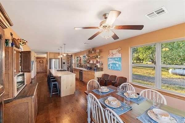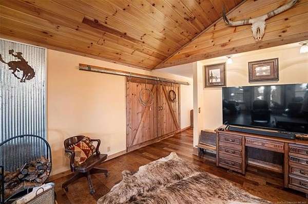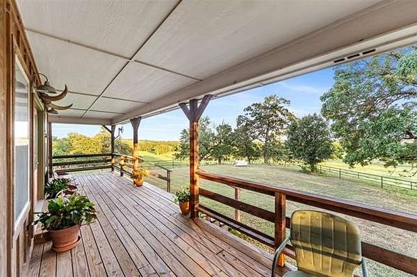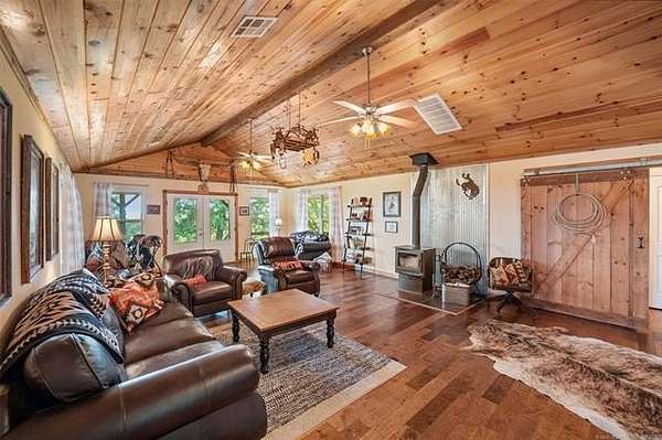 At the heart of the ranch sits a beautiful rustic 3-bedroom, 2-bath home showcasing warm woodwork, a vaulted living room ceiling, and a cozy wood-burning stove. A dedicated home office offers the flexibility to work remotely while enjoying the peaceful countryside. The spectacular wrap-around porch provides the perfect vantage point to take in hilltop views of the valley below, creating a picture-perfect setting for morning coffee or evening sunsets.