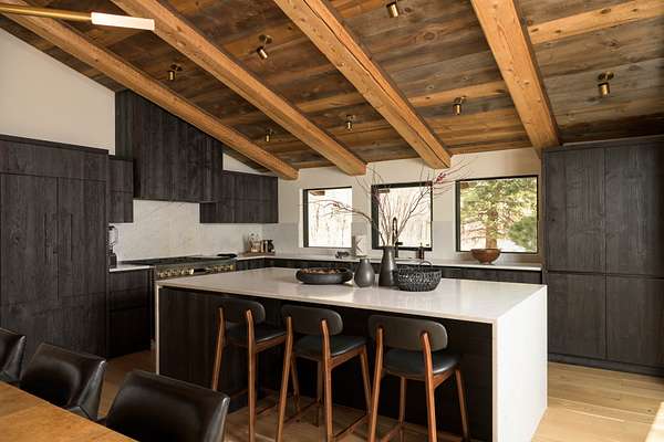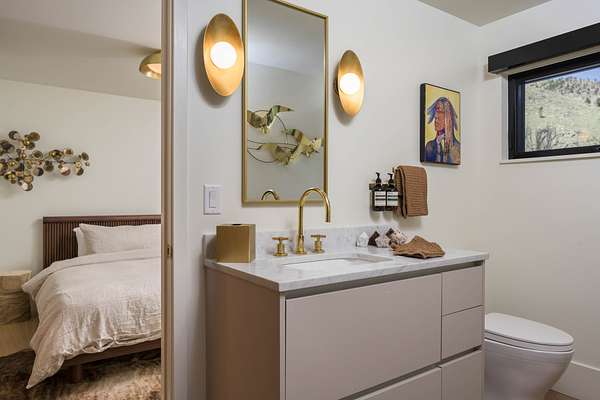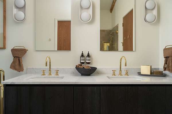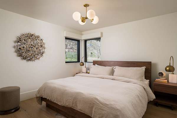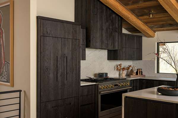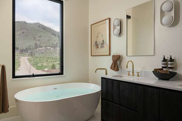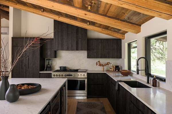 Inside, the kitchen features rustic dark oak cabinetry with a wire-brushed finish reminiscent of shou sugi ban with marble counters and a statement range--flowing seamlessly into open dining and living spaces perfect for both hosting and unwinding. Spa-inspired bathrooms include walk-in tile showers and massive soaking tubs that captures canyon views in stillness. High end designer lighting, custom woodwork, and layered natural materials create an atmosphere that is grounded, refined, and unmistakably personal.