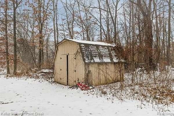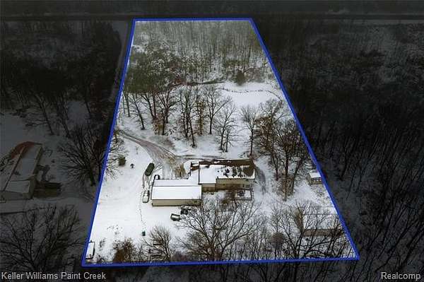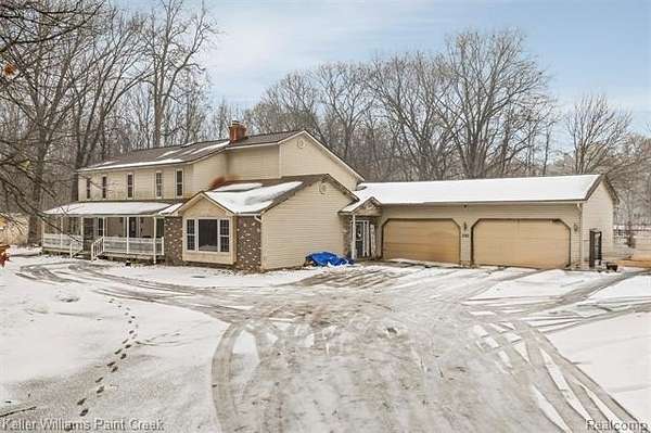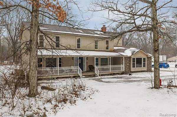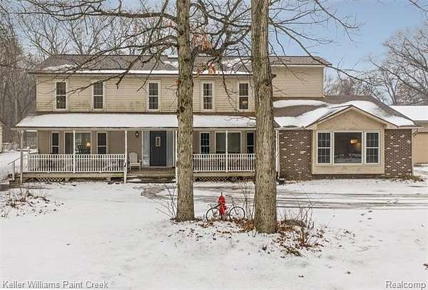 OPEN HOUSE SUNDAY 3/15 1-3 PM. $25K Price Improvement! Set on 4 acres adjacent to Proud Lake State Recreation Area and directly across from the park and boat launch, this property offers a rare sense of retreat that is increasingly hard to find. A long drive winds through mature trees to a quiet homesite overlooking a private pond, where protected land and seasonal scenery preserve the natural setting. This spacious colonial is thoughtfully positioned to capture its surroundings, featuring a covered front porch and large bay windows that bring in natural light. The home offers generous square footage and a practical layout - an excellent foundation for buyers looking to update and personalize a truly special property. A 4-car attached garage and unfinished loft area above provide both convenience and future flexibility. Beyond the home, the property truly shines with a 31x24 pole barn with electrical service, a separate shed with a concrete floor for lawn equipment, raised garden beds, and power already run to the pond for potential water features. Newer windows and furnace (approximately six years old) add meaningful value. Located in the Walled Lake School District. Acreage of this size, adjacent to protected state land, is rarely available at this price point. The value is in the land, setting, and long-term potential - offering a unique opportunity to create a private retreat in a location that cannot be replicated. Seller open to considering reasonable offers and possible concessions for updates.