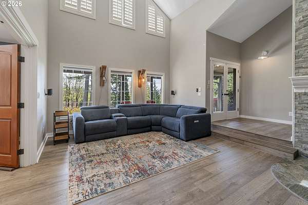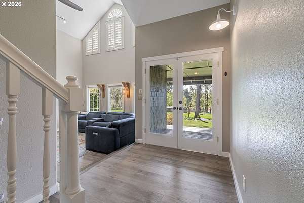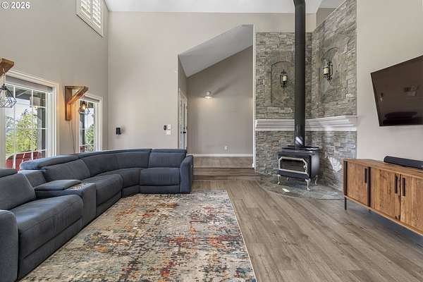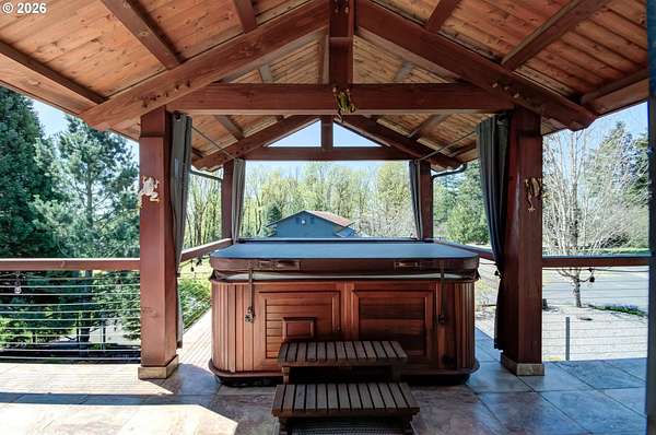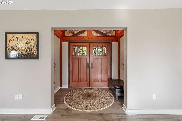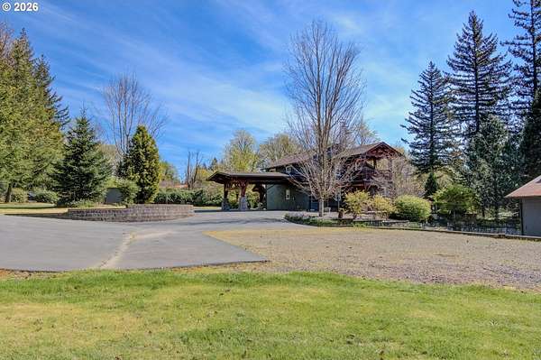 SPECTACULAR HOME W/ BARN & PASTURES. 5 bedrooms + office, 3 bathrooms, 3186 sqft on 5.4 acres. Timber framed entry invites you into the custom home that includes a huge vaulted living room w/ bay window, ceiling fan & skylights. Kitchen is updated w/ granite, island, pantry, matte black appliances & large dining area. Vaulted two-story family room w/ balcony & wood stove. Office upstairs w/ balcony to below. Primary bedroom w/ french doors, glass walk-in shower, huge closet & private deck w/ hot tub. Bedroom 2 upstairs. Bedroom 3 and 4 on the main. 5th bedroom has full bathroom at the other end of the house creating a great setup for guest quarters on the main level. Large mud room w/ laundry w/ access to the barn & acreage. 3 zone high-efficiency furnace w/ heat pump. Fiber internet at the street or Starlink equipment included with the sale. Covered back deck & lower patio w/ water feature overlooks the fenced yard & lower pastures w/ run-in shed. Paved driveway & RV parking plus a 2800 sqft shop w/ 9' door, heated office, workshop, stalls & storage area above. This is a special property in the country yet only 5 miles to Washougal.