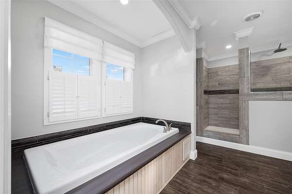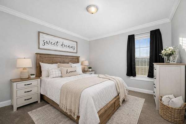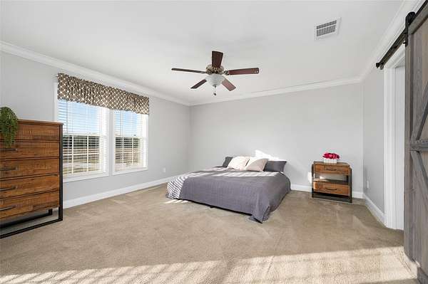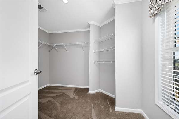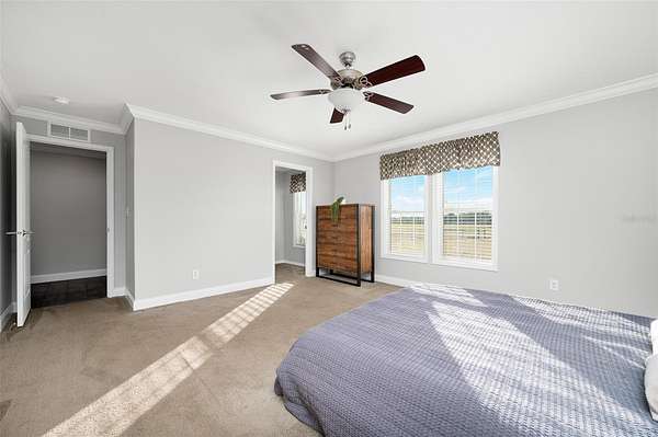 - Ceiling Fans(s), Crown Molding, Eat-In Kitchen, Kitchen/Family Room Combo, Living Room/Dining Room Combo, Open Floorplan, Primary Bedroom Main Floor, Split Bedroom, Thermostat, Tray Ceiling(s), Walk-In Closet(s), Window Treatments
