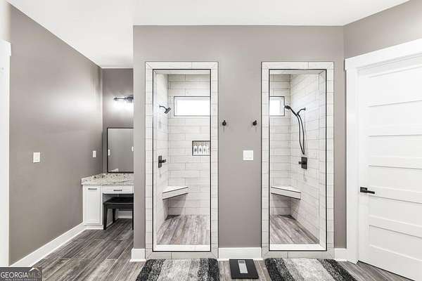 - Beamed Ceilings, Double Vanity, High Ceilings, Master On Main Level, Separate Shower, Split Bedroom Plan, Tile Bath, Vaulted Ceiling(s), Walk-In Closet(s)