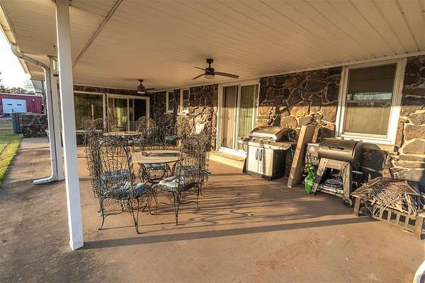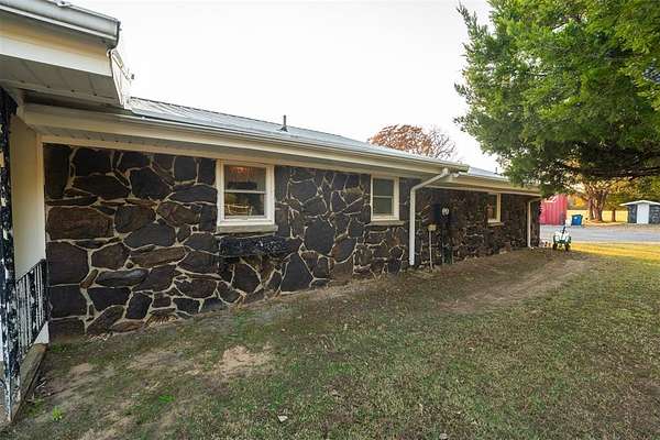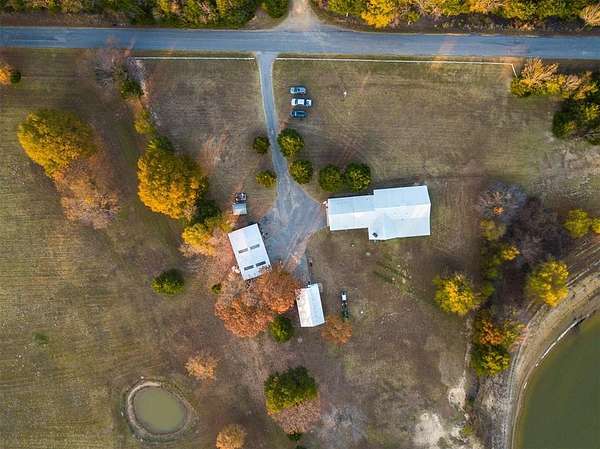 Experience peaceful lake living on this 13.5 +/- acre waterfront retreat on beautiful Lake Eufaula. The property features a charming rock-exterior home with a durable metal roof, large scenic windows, and spacious rooms offering direct water views throughout. Enjoy open pasture, mature trees, and multiple outbuildings, including a 36'*15' +/- barn and a 29'*49' +/-shop with three bay doors, new spray-foam insulation, and power. A rain-fed pond recently pumped septic system, and three hot water heaters provide added convenience. The home offers direct lake access and a covered patio off both the living room and primary suite. Ideal for a full-time residence, weekend retreat, or investment opportunity, with room for additional structures if desired. A rare 13.5 +/- acre waterfront property with sweeping views and exceptional privacy.