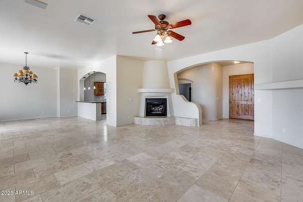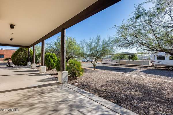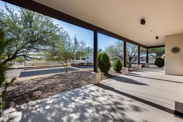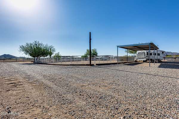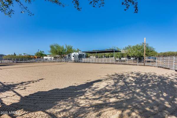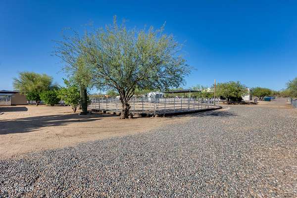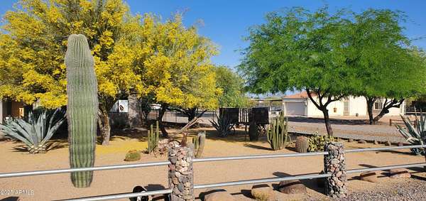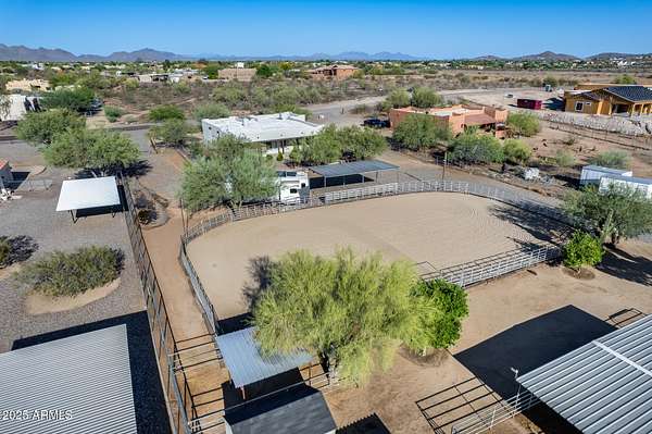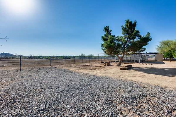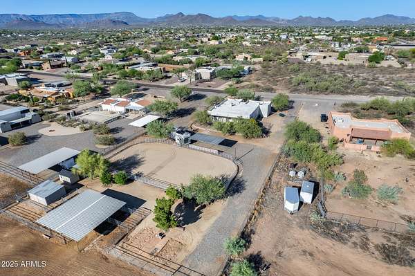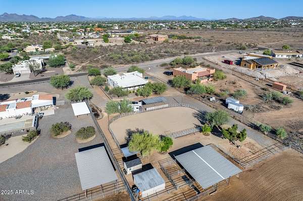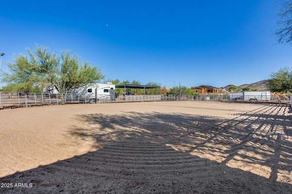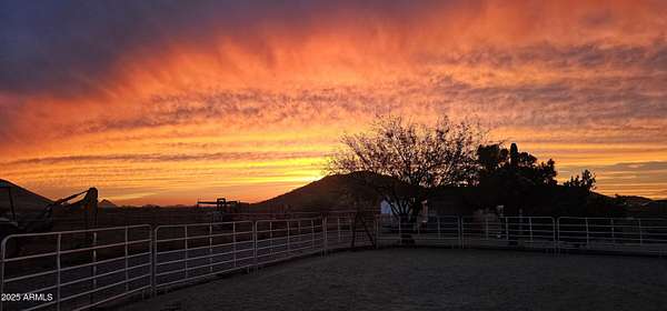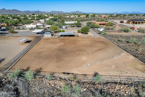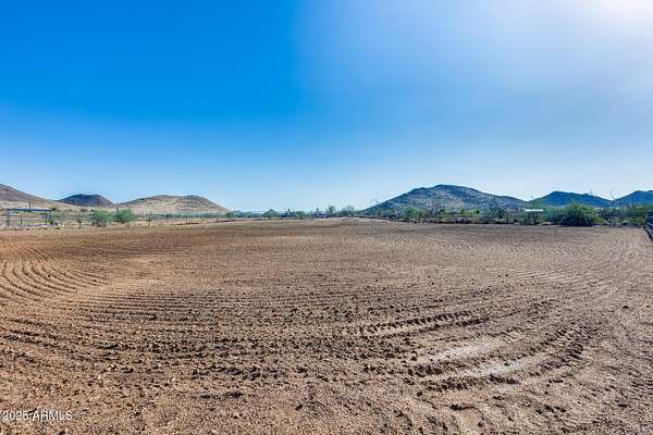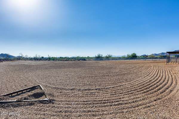 Welcome to your dream horse property! This beautifully designed 4-bed, 2-bath Ranch-Style home sits on 2.3 fully fenced acres, offering the perfect blend of Comfort, Functionality, and Horse-ready features with everything you need. The spacious split floor plan features a great room and a chef's kitchen with granite countertops, a center island, breakfast bar, custom cabinetry, and a built-in wine rack. Equestrian features include a 6-stall mare motel with water, a lighted 115' x 52' arena, and enclosed hay storage and Tuff Shed. There's a covered, pull-through area for RV and horse trailer parking, an oversized 3-car garage, and a high-producing private well, shared with only one neighboring property. Enjoy unobstructed mountain views and stunning sunsets, with no neighbors directly across, and preserve land to the west. Located on a quiet, dead-end road in a private pocket neighborhood, the property offers direct access to hundreds of acres of State Trust Land just minutes away. Additional features include mature lemon and orange trees, and full no-climb fencing from the patio to the back lot line. This is true ranch living with modern comforts and wide-open freedom!