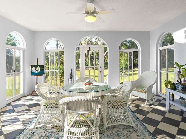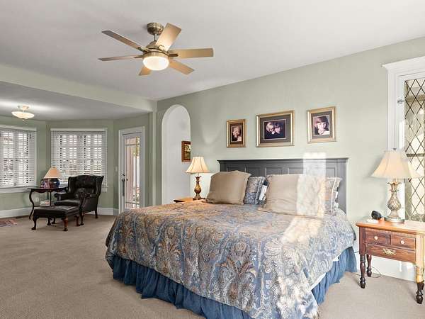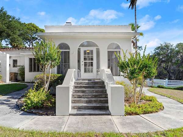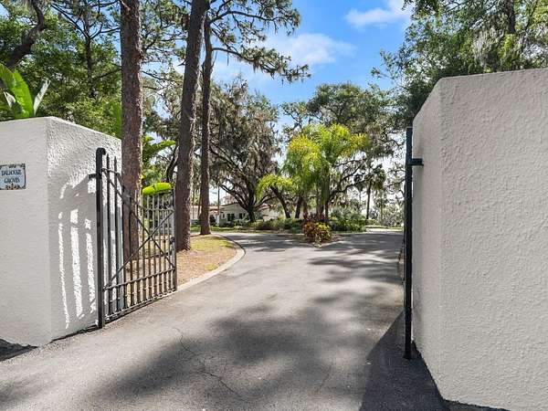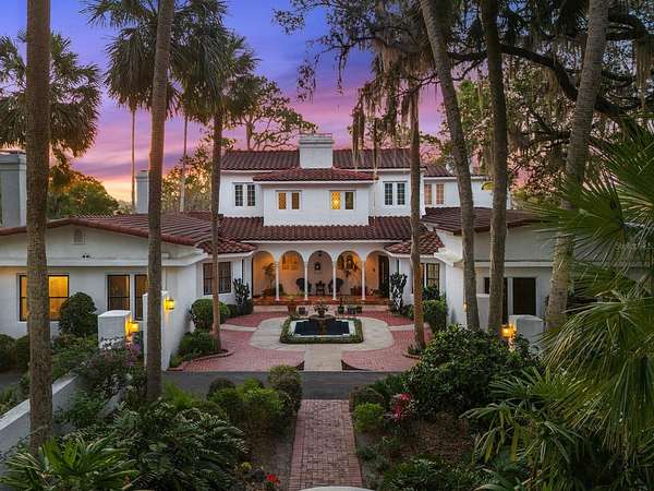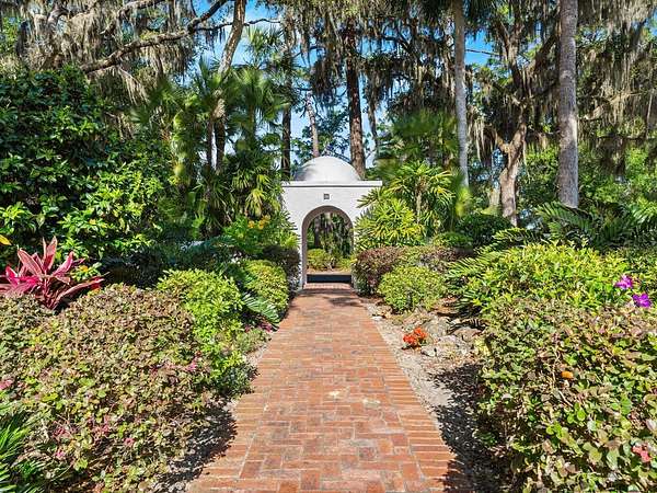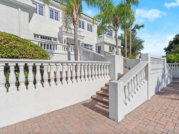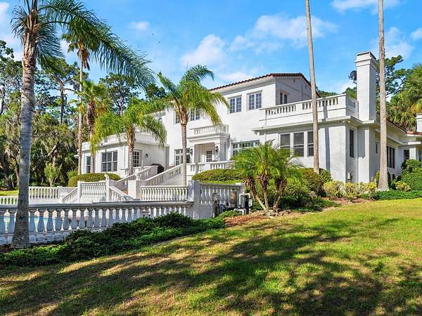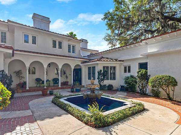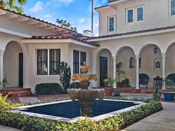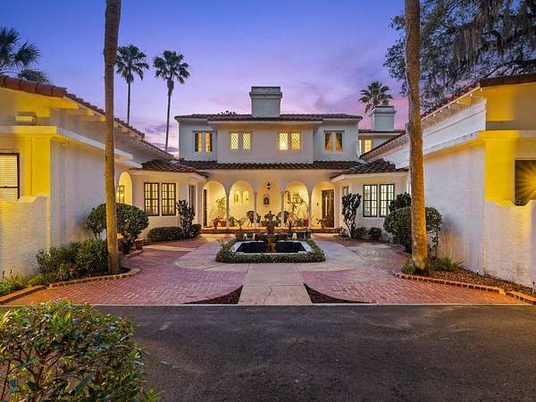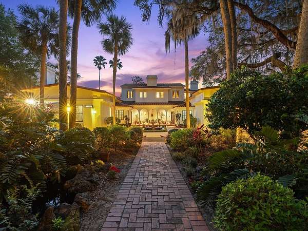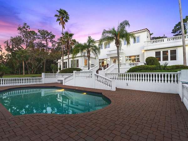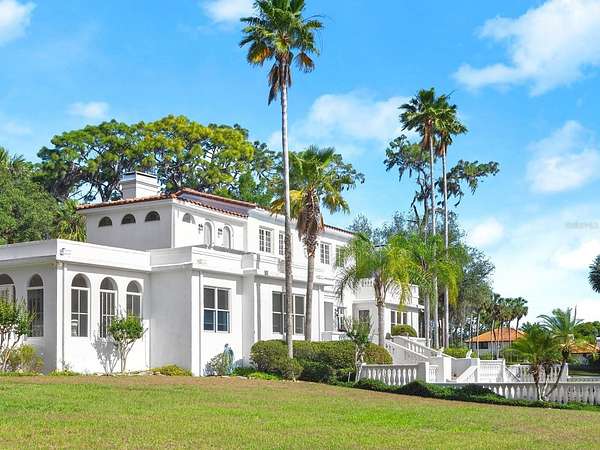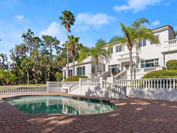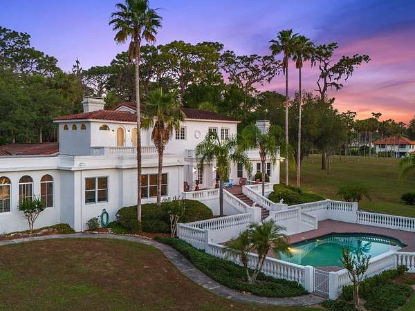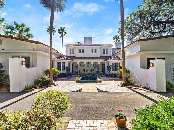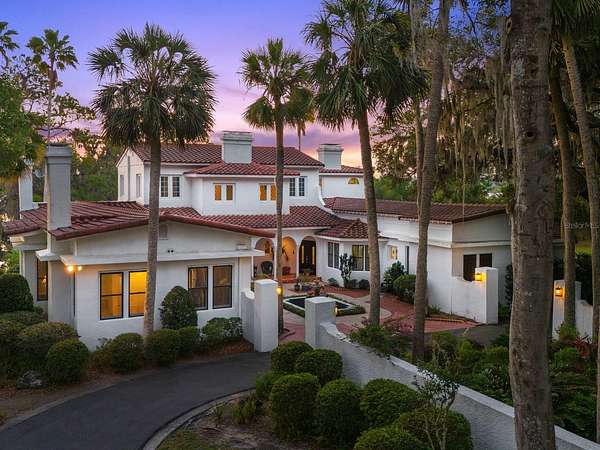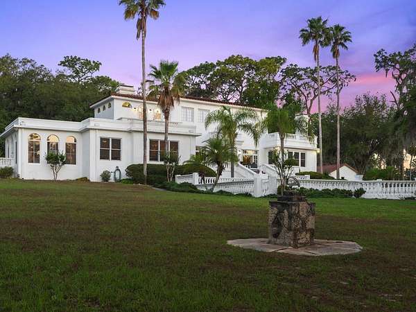 Come, step back into time to a magnificent waterfront Mediterranean estate that is perfectly positioned on 6 acres and 442 feet of direct frontage on pristine spring fed Lake Dalhousie where residents enjoy swimming, fishing, boating, water skiing and kayaking. A true retreat from the city life and one of the prettiest areas in Lake County. It enjoys the best of both worlds, uncrowded, peaceful country living, but close to shopping, major highways and the beaches. The grounds are enchanting but become sublime as you take in the spectacular early morning sunrise and golden hour that reflects on the home in a rich fairy tale glow. Stroll through the grounds where you will find stately grandfather oaks, bricked walkways, 1926 domed pavilion and emerald lush gardens all irrigated from the lake. You will notice the original 4-story water tower which, is no longer in use but stands tall capturing attention, making it one of the homes most iconic features. Commissioned with grandeur and built to endure in 1926 by Dr. Edgar J. Banks, a noted archeologist who began coming to Eustis in 1916 and today, this spectacular Mediterranean is ready to celebrate her 100th year old birthday. A peaceful courtyard entry with a stately fountain, loggias and Mahogany glass door entry add to the excitement and hint at the elegance within. Approximately over 6,200 square feet of living area consist of 2 master suites, 4 guest bedrooms and 5 1/2 baths. Upgraded plumbing and electric, volume ceilings, graceful arches, beautiful oak wood flooring, ornate fireplaces, large baseboards, iconic chandeliers, original Tudor style windows and newer windows that include Pella, Andersen, Marvin and Jeld-Wen, blend period charm with newer and modern conveniences. The grand ballroom overlooks the lakefront and features large parquet flooring and cherry wood inlay. The volume ceilings are graced with beautiful chandeliers, decorative hand carved plaster border and showcased with a handsome Artisan European gas fireplace. French doors open wide to the outdoor terrace which overlooks the 20x40 inground pool with stone paver decking, and mesmerizing views of the lake. The formal dining room features parquet flooring, Tudor style windows, coffered ceilings and original gas fireplace with a white mantle that has been delicately carved with the words Dolce Far Niente, meaning Sweetness of Doing Nothing. The generous kitchen, breakfast room and family room overlook the lakefront and have been completely redesigned with oak flooring, Quartz countertops, stainless steel appliances, French Country cabinetry and marble backsplash. The exterior back of the home stands tall and magical and features a magnificent focal point, designed with an abundance of white balustrades, the 20x40 inground salt pool, a terrace that spans the back of the home and a private master suite second story balcony. Perfectly designed for grand scale entertaining or tent the lawn for a beautiful outdoor wedding. The back yard features a gentle slope to the lakefront with long extended dock and a boathouse that currently houses a 21-foot boat and room for another. The main house features a 2-car garage, and another 4-1/2 car garage was added to the 4-story water tower. Other highlights include a very clean and neat large basement with upscale Kinetico water system and other mechanicals. This is a rare opportunity to own an original and architecturally stunning Mediterranean period home that seldom comes to market.