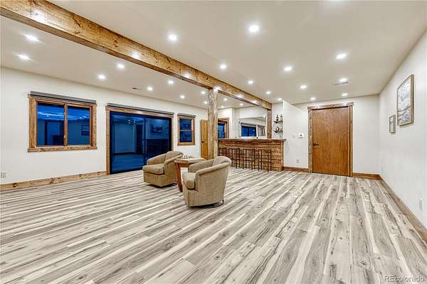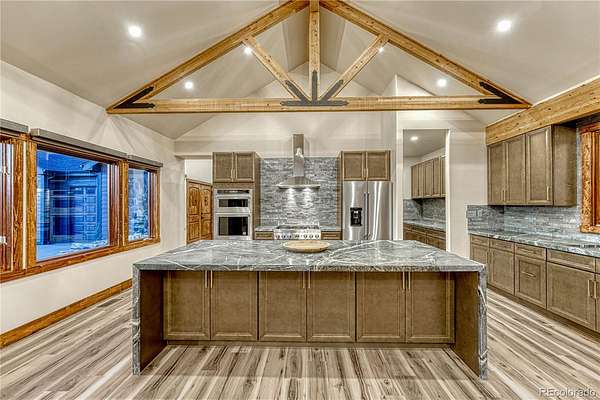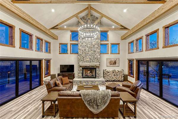 Set behind a private gate, this exceptional horse property delivers total privacy without sacrificing convenience. This walk-out ranch showcases a stunning open design with vaulted ceilings, decorative beams, a statement chandelier, and rich 7” hickory floors. A dramatic floor-to-ceiling wood fireplace anchors the living space and is beautifully echoed on the exterior. Walls of new windows and sliding glass doors flood the home with natural light, while a full wraparound deck captures breathtaking views in every direction.