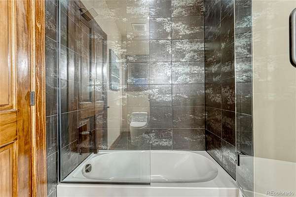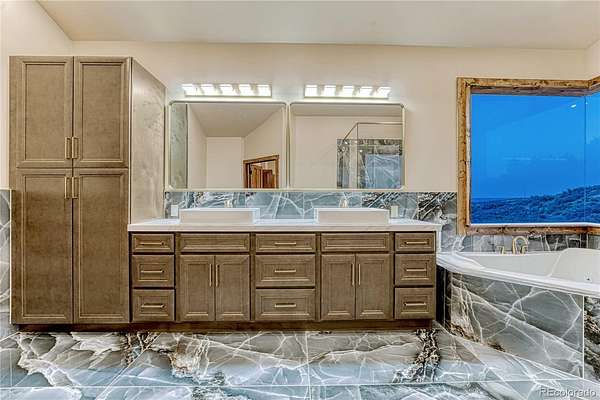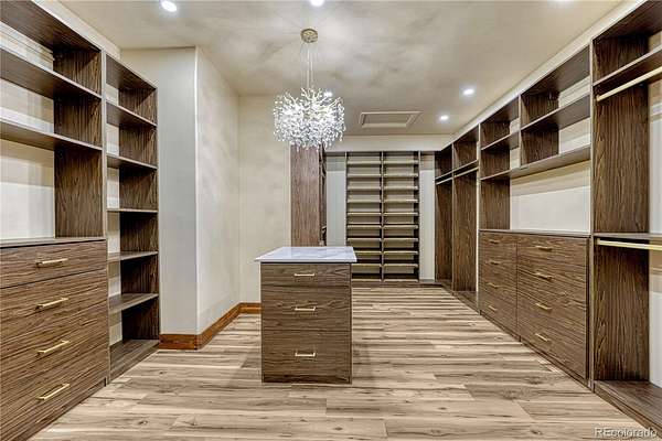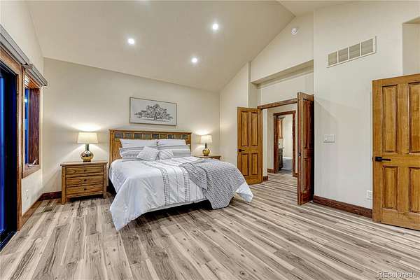 The main-level primary suite is a true retreat with vaulted ceilings and double glass doors opening to the expansive deck on three sides. The spa-inspired bath is unforgettable—dual toilet rooms, slab tile floors and walls, glass-enclosed shower, deep soaking tub, and an oversized custom walk-in closet with built-ins and chandelier.