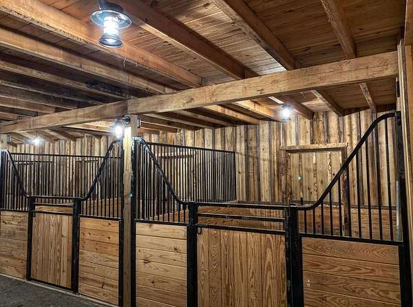 Complementing the venue is a five-stable equestrian barn, newly constructed in 2021, featuring a one-bedroom apartment that overlooks the stalls. The grounds also include a picturesque outdoor ceremony site, offering sweeping views of Middle Tennessee's rolling hills.