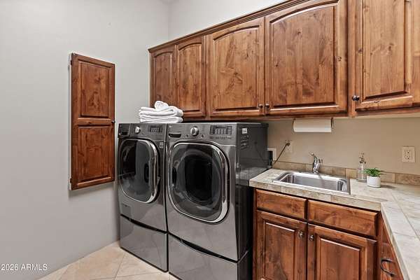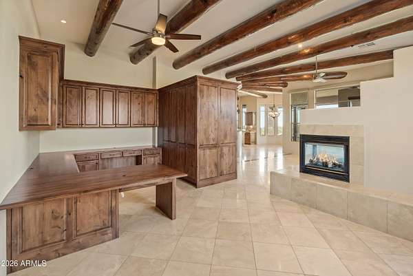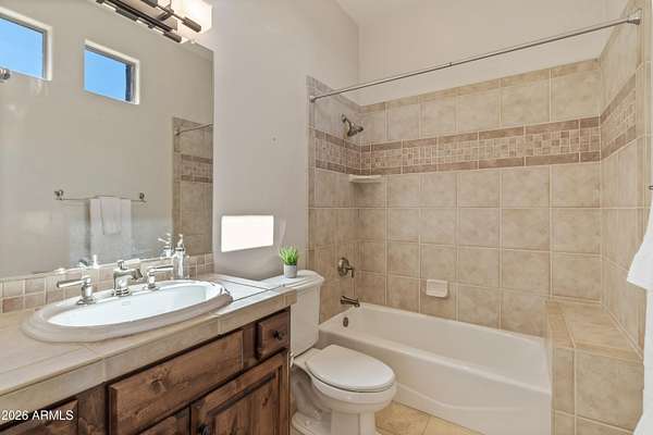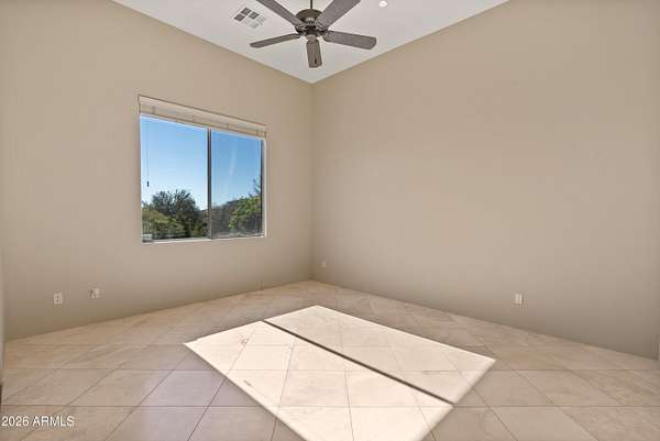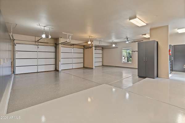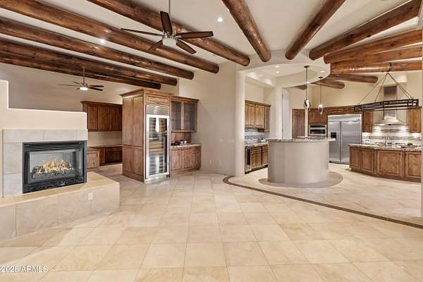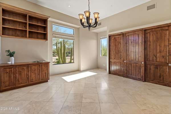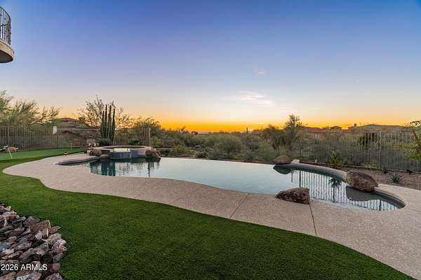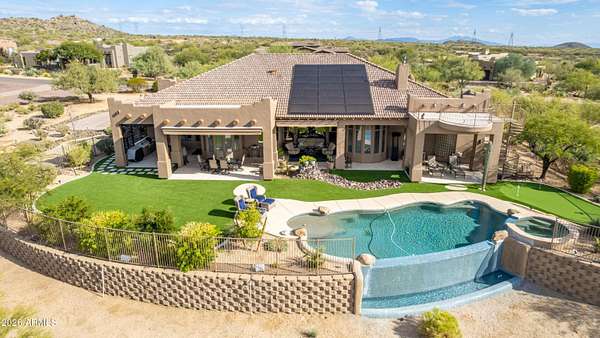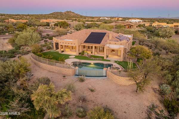 Wake up to endless skies, radiant sunsets, and shimmering city lights from this exceptional North Scottsdale sanctuary, privately set on nearly 2 scenic acres. Designed for those who value space and privacy, this 4-bedroom, 3.5-bath residence offers over 4000 square feet of refined desert living with a rare balance of beauty and livability. At the heart of the home is a beautifully updated kitchen showcasing premium appliances, warm custom cabinetry, extra-thick granite countertops, pull-out drawers, and a substantial island ideal for gathering and entertaining. Thoughtful upgrades include a new oven, microwave, dishwasher, mini-fridge, updated faucets, and an expanded pantry with added cabinetry, blending everyday function with timeless style. The primary suite is a true retreat, featuring spa-inspired finishes, a two-sided fireplace, a jetted soaking tub, new fixtures, and comfort upgrades designed for relaxation at the end of the day. Additional interior enhancements include a new water heater, upgraded entry door, invisible screen doors, and curated architectural details such as Vega beams, art niches & custom finishes that add texture and character throughout the home Versatility defines the family room, thoughtfully configured to accommodate a hobby studio, fitness space, or creative retreat, accented by custom architectural walls. A whole-home indoor/outdoor Sonos sound system enhances both lively gatherings and quiet nights in. Outdoors, the property transforms into a private desert escape. A negative-edge pool and spa with automated controls, updated pool equipment, waterfall feature, artificial grass with travertine stepping stones, privacy screens, and mature landscaping create a resort-style setting ideal for year-round enjoyment. Multiple patios feature new ceiling fans, retractable sunshades, and an upgraded BBQ area, perfect for entertaining against a dramatic desert backdrop. The expanded garage impresses with epoxy flooring, built-in cabinetry, oversized doors, workshop and man-cave space, added outlets, EV charging, and new garage doors. Practical and energy-efficient upgrades include a fully owned Tesla solar system with backup batteries, extended driveway with pavers, recent exterior paint, roof coating, improved drainage, snake-proofed backyard, and EV readiness - delivering peace of mind and long-term value. Tucked away in a peaceful enclave near Mirabel and Desert Mountain, this remarkable property offers the perfect blend of refined desert living, ideal as a full-time residence or a luxurious seasonal retreat.