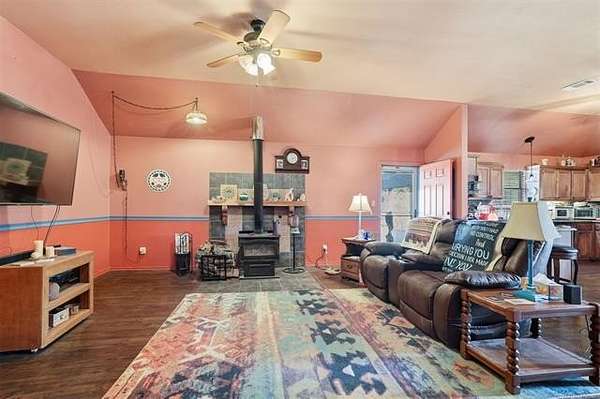 Energy-efficient 3BR home on 5 wooded acres just 2.5 miles north of Ft. Towson. Interior features 10-ft cove ceilings with a southwest color scheme. Spacious open living area with a cozy wood stove that flows into the large kitchen with granite counters, birch cabinets, and pantry. Master bath has dual sinks, shower, jetted tub, and his/her walk-ins. Includes 48 U.S.-made solar panels (only 4 electric bills over $29 since install) and also wired for a generator and there is one available for purchase. There are 2 wells on the property, the new one that the house is hooked up to as well as a backup. There is a nice open 12 x 24 porch adjacent to the living area and a 20x20 garage with 8.5x6 corner cubby for tools and such. Chain-link fenced yard with several peach trees. Septic is a 1,000 gallon tank with 300 ft of lateral lines. Land features include a pine hardwood mix with rolling hills and a creek dissecting the property with deer crossings on both sides! Plenty of privacy, plenty of efficiency and enough space for comfort!