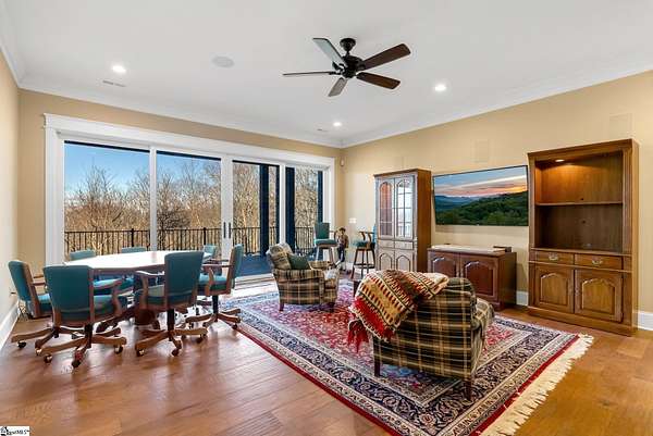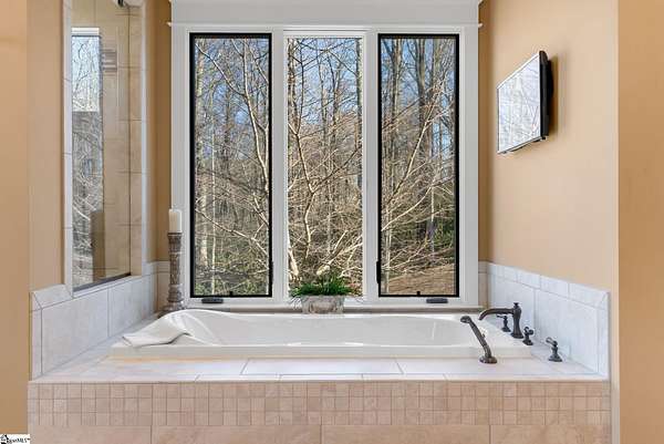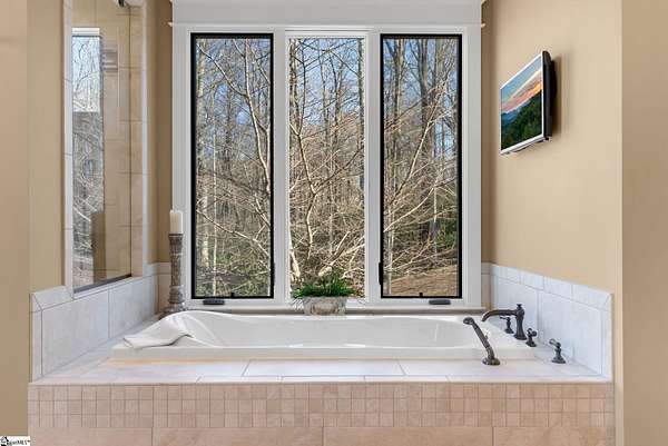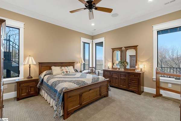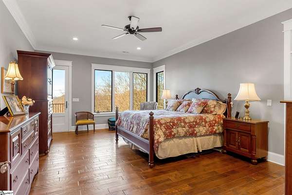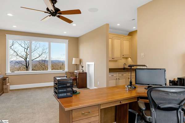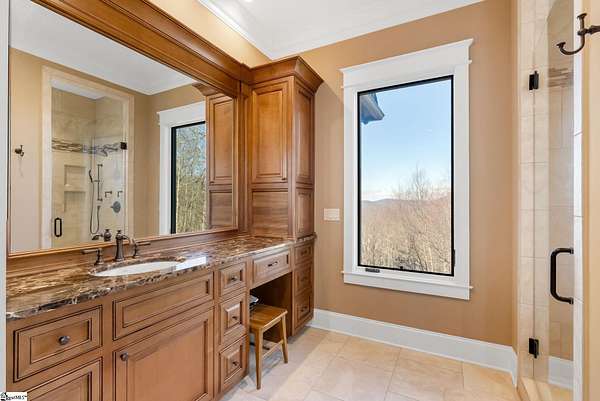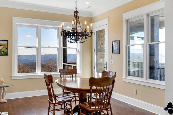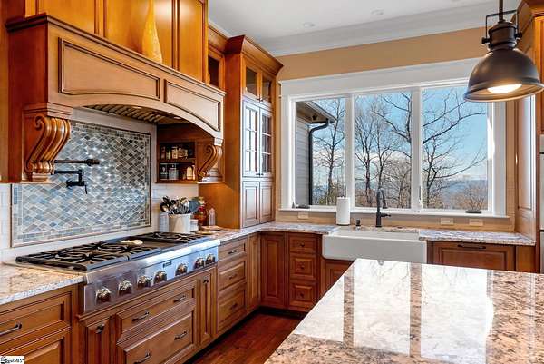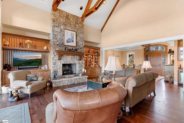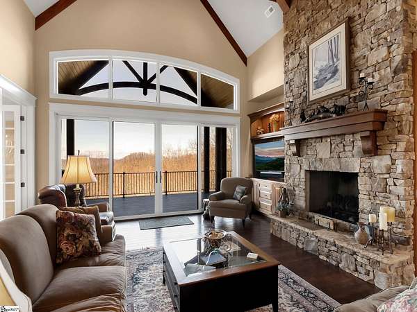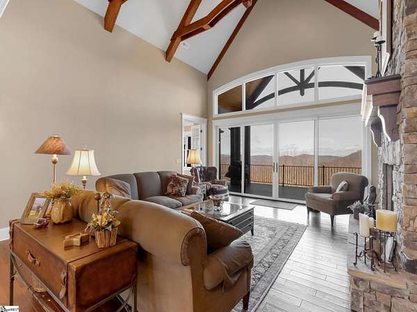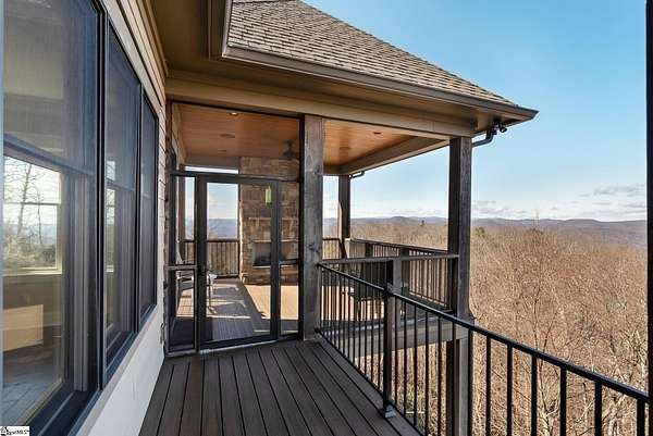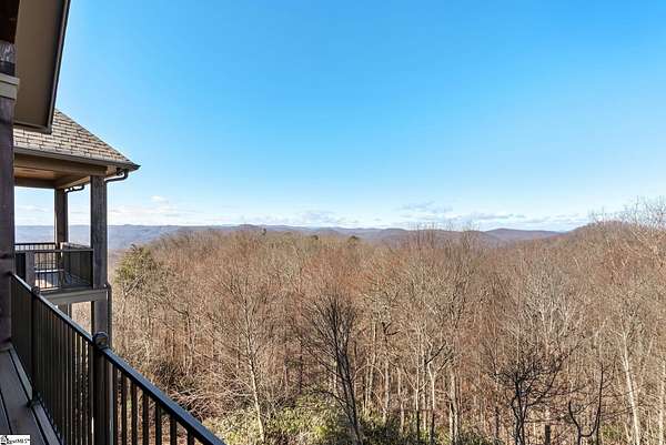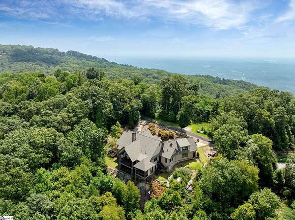 This mountain estate sits at over 2,600' unfolding panoramic, long-range mountain views that stretch endlessly to the horizon. Tucked away on a private, non-through street, this home is oriented to capture north-to-northwest light and ever-changing vistas. Exterior porches and interior living spaces offer peaceful sanctuaries in an effortless blend of natural grandeur and sophisticated mountain living atop The Cliffs at Glassy. The welcoming entry and artfully landscaped grounds set the tone for this curated home, where rustic character is balanced with timeless traditional accents. Upon entering, you're drawn to long-range mountain views that anchor the home's design. The great room showcases vaulted, beam-accented ceilings and a dramatic floor-to-ceiling stone fireplace with custom wood mantel, creating a warm yet refined focal point. Illuminated built-in cabinetry adds both function and elegance, while the adjoining dining room and butler's pantry wet bar offer an inviting setting for entertaining, gathering, and enjoying relaxed evenings at home. Just off the main living area, the gourmet kitchen and adjoining breakfast area are designed to satisfy both the passionate home chef and effortless everyday living. Custom Maple Ridge cabinetry anchors the space, blending warmth with refined craftsmanship. A generous island with bar seating invites connection, while luxury branded appliances, six-burner gas cooktop with electric griddle, and dedicated secondary prep sink support ambitious culinary pursuit. Framed by breathtaking mountain views, the kitchen becomes not only a workspace, but a welcoming gathering place where cooking, conversation, and comfort come together. Adjacent outdoor living spaces include covered porches, a stone fireplace, and expansive Trex decking, positioned to capture panoramic Blue Ridge Mountain views. The large walk-in pantry features custom shelving, while the laundry room boasts extensive built-ins, pantry cabinet, & work sink. The oversized, attached three-car garage provides exceptional functionality with built-in cabinetry, utility sink, front & rear service doors, & tiled dog bath. The primary suite exudes warmth and sophistication, featuring direct deck access and high windows that frame the stunning mountain views. The spa-inspired bath delivers exceptional comfort with dual vanities with built-in storage garages with interior outlets, walk-in shower, soaking tub, & generous walk-in closet with center double-sided drawer bank, built-in laundry hampers & ironing board cabinet. A full bath & additional bedroom, ideal for home office or studio, complete the main level. An upper level en-suite bonus room is suitable as guest room, home office, or flex space, & offers mountain views & privacy while maintaining convenient access to the main living areas below. Large attic spaces are accessible for additional storage. The lower level is designed as a welcoming guest retreat from which to enjoy views from the expansive deck and rear yard which features striking natural rock outcroppings. Along with two well-appointed bedrooms with baths en suite, this level features a spacious recreation room with custom built-ins and two unfinished areas for storage or future expansion. Additional features include JeldWen windows & exterior doors, Hickory hardwood floors through the main level, whole-house Generac generator, Carolina Closet organizers, recessed audio speakers and ceiling fans in most rooms, exterior cameras, and Control 4 home automation system with two keypads. This residence effortlessly combines superior craftsmanship, thoughtful design, and timeless elegance, framed by stunning layered mountain views, backing up to 18,000 acres of the Greenville Watershed. Experience the perfect harmony of mountain tranquility just minutes from the Glassy clubhouse & Glassy Chapel. A Club membership at The Cliffs is available for purchase with this property giving you access to all seven communities.