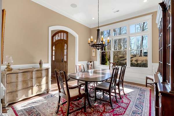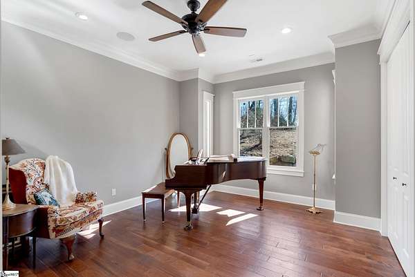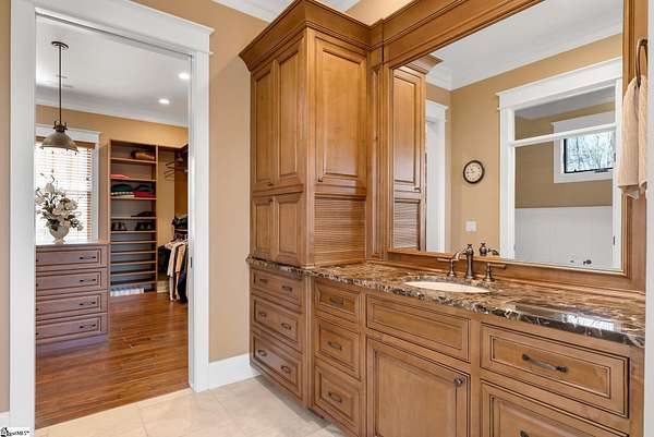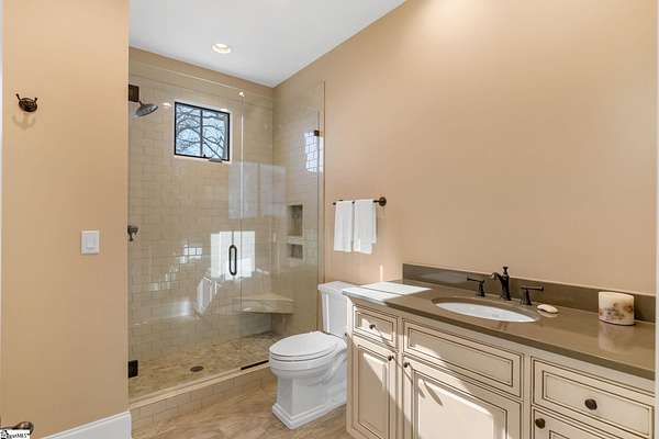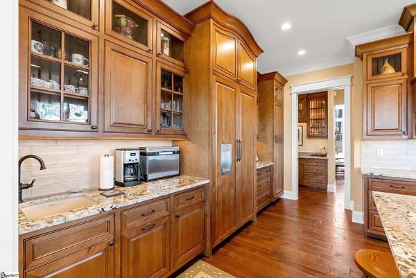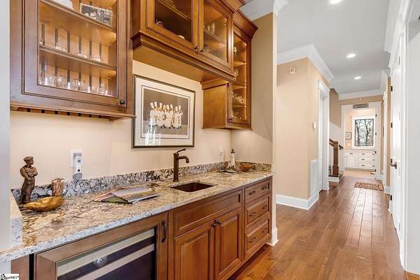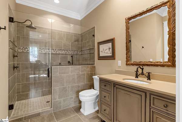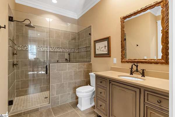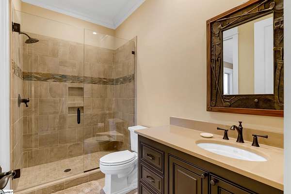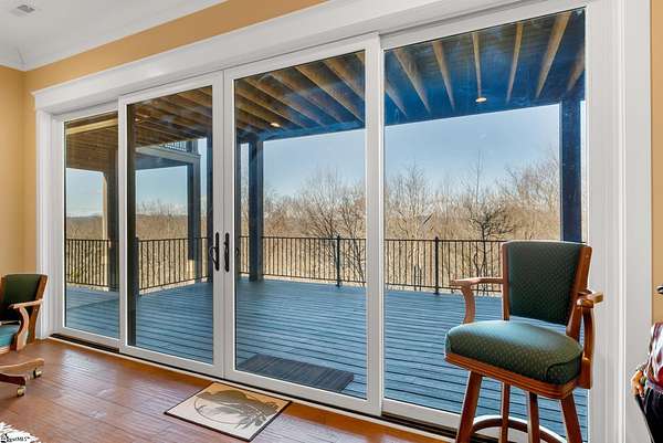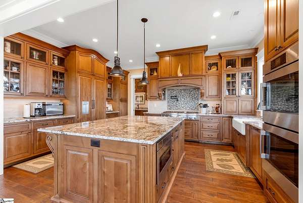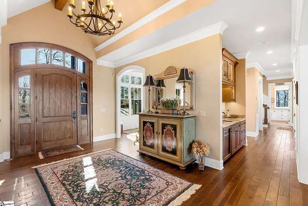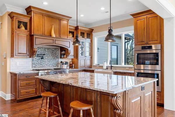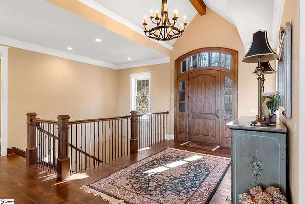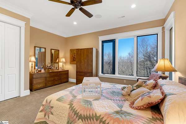 This mountain estate sits at over 2,600' unfolding panoramic, long-range mountain views that stretch endlessly to the horizon. Tucked away on a private, non-through street, this home is oriented to capture north-to-northwest light and ever-changing vistas. Exterior porches and interior living spaces offer peaceful sanctuaries in an effortless blend of natural grandeur and sophisticated mountain living atop The Cliffs at Glassy. The welcoming entry and artfully landscaped grounds set the tone for this curated home, where rustic character is balanced with timeless traditional accents. Upon entering, you're drawn to long-range mountain views that anchor the home's design. The great room showcases vaulted, beam-accented ceilings and a dramatic floor-to-ceiling stone fireplace with custom wood mantel, creating a warm yet refined focal point. Illuminated built-in cabinetry adds both function and elegance, while the adjoining dining room and butler's pantry wet bar offer an inviting setting for entertaining, gathering, and enjoying relaxed evenings at home. Just off the main living area, the gourmet kitchen and adjoining breakfast area are designed to satisfy both the passionate home chef and effortless everyday living. Custom Maple Ridge cabinetry anchors the space, blending warmth with refined craftsmanship. A generous island with bar seating invites connection, while luxury branded appliances, six-burner gas cooktop with electric griddle, and dedicated secondary prep sink support ambitious culinary pursuit. Framed by breathtaking mountain views, the kitchen becomes not only a workspace, but a welcoming gathering place where cooking, conversation, and comfort come together. Adjacent outdoor living spaces include covered porches, a stone fireplace, and expansive Trex decking, positioned to capture panoramic Blue Ridge Mountain views. The large walk-in pantry features custom shelving, while the laundry room boasts extensive built-ins, pantry cabinet, & work sink. The oversized, attached three-car garage provides exceptional functionality with built-in cabinetry, utility sink, front & rear service doors, & tiled dog bath. The primary suite exudes warmth and sophistication, featuring direct deck access and high windows that frame the stunning mountain views. The spa-inspired bath delivers exceptional comfort with dual vanities with built-in storage garages with interior outlets, walk-in shower, soaking tub, & generous walk-in closet with center double-sided drawer bank, built-in laundry hampers & ironing board cabinet. A full bath & additional bedroom, ideal for home office or studio, complete the main level. An upper level en-suite bonus room is suitable as guest room, home office, or flex space, & offers mountain views & privacy while maintaining convenient access to the main living areas below. Large attic spaces are accessible for additional storage. The lower level is designed as a welcoming guest retreat from which to enjoy views from the expansive deck and rear yard which features striking natural rock outcroppings. Along with two well-appointed bedrooms with baths en suite, this level features a spacious recreation room with custom built-ins and two unfinished areas for storage or future expansion. Additional features include JeldWen windows & exterior doors, Hickory hardwood floors through the main level, whole-house Generac generator, Carolina Closet organizers, recessed audio speakers and ceiling fans in most rooms, exterior cameras, and Control 4 home automation system with two keypads. This residence effortlessly combines superior craftsmanship, thoughtful design, and timeless elegance, framed by stunning layered mountain views, backing up to 18,000 acres of the Greenville Watershed. Experience the perfect harmony of mountain tranquility just minutes from the Glassy clubhouse & Glassy Chapel. A Club membership at The Cliffs is available for purchase with this property giving you access to all seven communities.