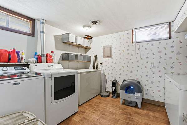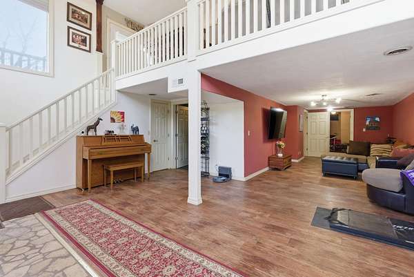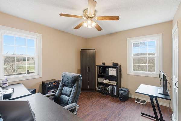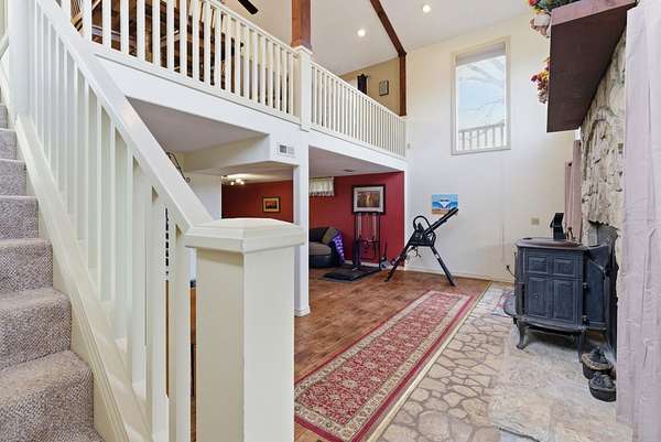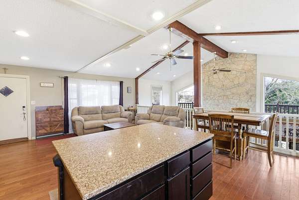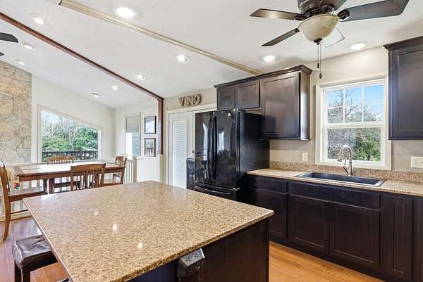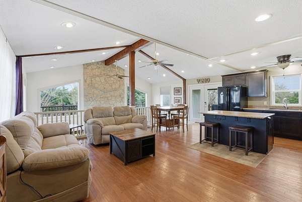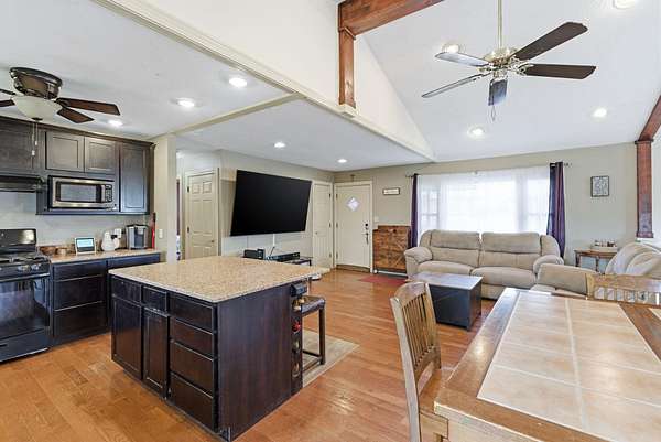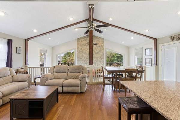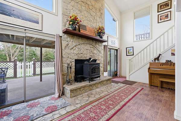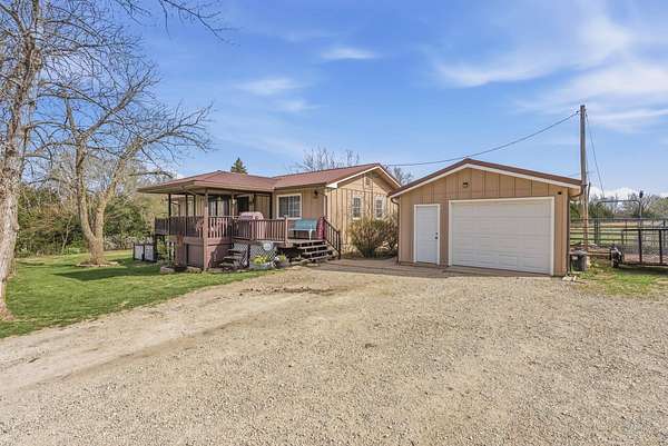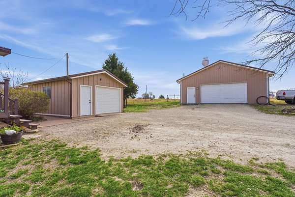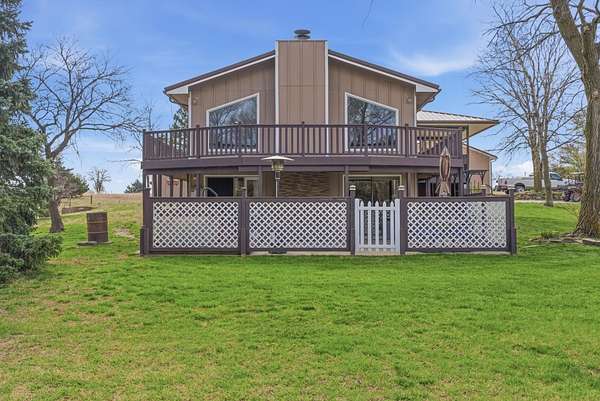 Lakeside or Countryside? Why choose when you can have them both! Situated on 4 1/2 acres, this 4 bed and 2 bath home comes with a 1 1/2 car detached garage and a 1,500 sq ft shop with radiant heat and separate meter. You'll also find a wood shed, a garden shed and horse stalls. The metal roofs and gutters were recently updated in 2021, ensuring years of worry-free maintenance. Step inside to a spacious, open layout design where the kitchen, dining, and living areas flow seamlessly together. The main living space opens to a balcony overlooking the lakeside, featuring a fireplace surrounded by large windows that frame the stunning water views. The main level offers a unique tree house experience with views through majestic blue spruce trees toward the sparkling water. The recently updated kitchen is perfect for entertaining and daily living, while the basement stacks an additional 220 sq ft expansion. The lakeside lifestyle amenities are truly unmatched. With two buildable lots, there's incredible potential for expansion. Enjoy private lake access for canoeing, boating, and water activities right from your backyard. The free swimming beach on the west side near the lake hall provides perfect summer recreation, while the 3 1/2 mile road around the lake offers scenic daily walks and exercise. You will love the regular visits from cardinals, blue jays, eagles, and hummingbirds. Additional lake amenities include a lake office with fishing supplies, shower house facilities, and access to Marion County Park and Lake events and festivals throughout the year. This property is perfect for rural living enthusiasts seeking peace and tranquility, animal lovers with the ideal setup for horses and chickens, fishing and water sports fans with direct lake access and nature lovers who appreciate abundant wildlife and scenic beauty. Imagine waking up to the sound of birds chirping, enjoying your morning coffee while watching an eagle soar over the lake, and ending your day with a peaceful canoe ride as the sun sets behind the blue spruce trees.