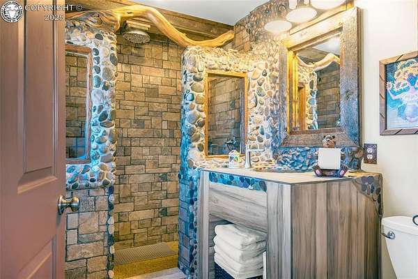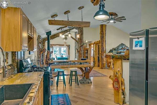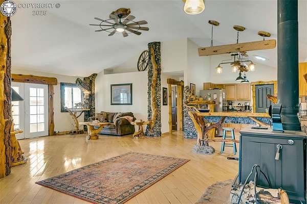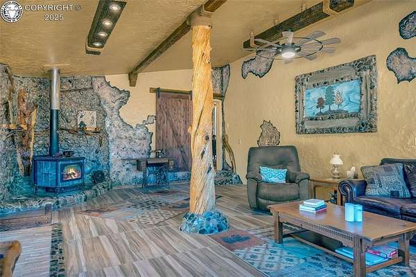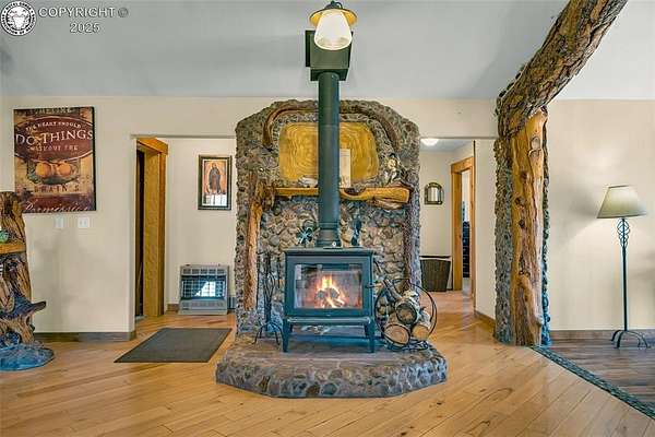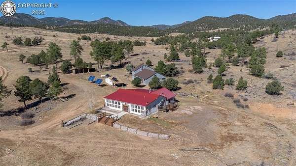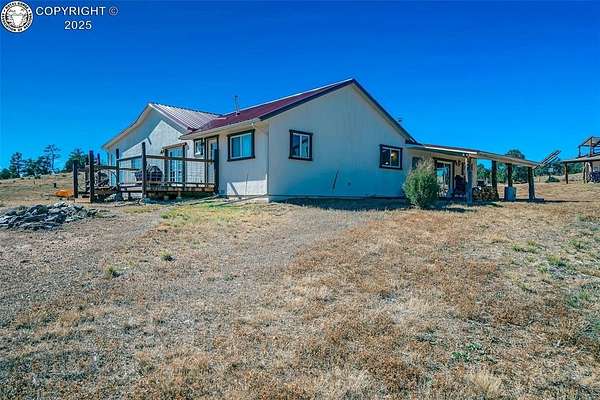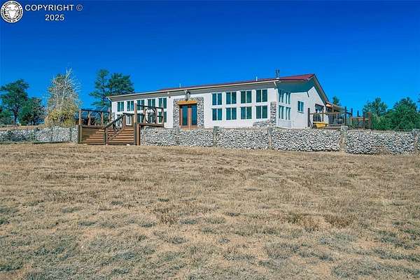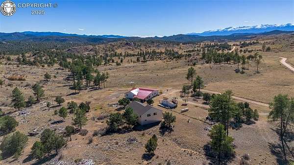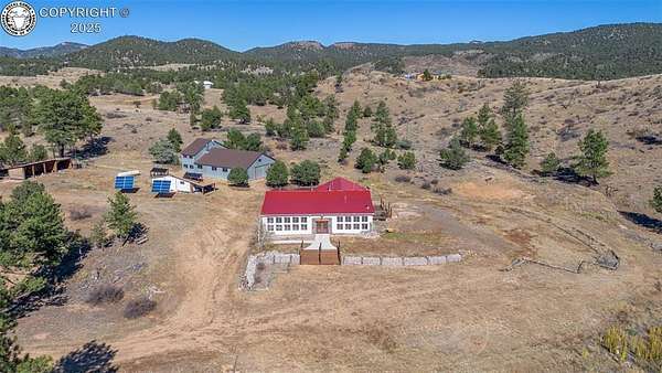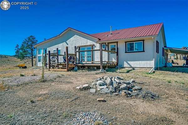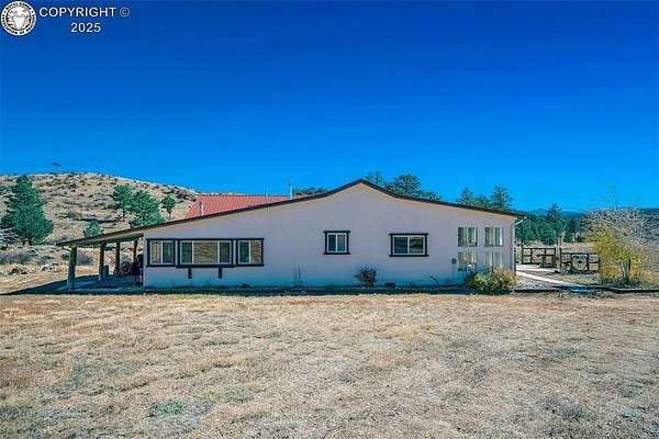 This beautiful 4-bedroom, 3 bath home is a nature lover's dream. Located just off of County Rd 1 (Iron Mountain Rd) which is a county-maintained road and Mac Donnell Dr which is a Glen Vista graveled road. This property is not in the HOA! One corner of the property borders 79 acres of BLM, with thousands more in the surrounding area. Enjoy peace and solitude on 22 acres of varied terrain, with open meadows, trees, rolling hills and amazing views of the Sangre de Cristo Mountains. As you enter the front entrance you are greeted with an artistic masterpiece of natural stone and wood, a theme that continues throughout the home. Each room reveals creative and magical creations. The enclosed heated front patio is bright and spacious, inviting you to sit and take in the peaceful surroundings. Imagine an indoor greenhouse, art studio, play area, the possibilities are endless with this amazing space. This custom-built home has a floor plan that is very well thought out. The open great room, with vaulted ceilings and a cozy woodstove, combines the living room, kitchen and dining room into a perfect area for gatherings with friends and family. The huge family room with a second woodstove, is close by but separate. The master bedroom is spacious and private, being on the opposite side of the house from the other bedrooms. One of the bedrooms, currently being used as a home office, is located away from the remaining two bedrooms, again providing lots of privacy. The 2000 sq ft pole barn/garage/workshop has so many possibilities. This isn't just a home, it's a mountain lifestyle, where every detail is designed to bring comfort, beauty, and nature together. The solar system is paid off and has new lithum batteries. The 1000 gallon propane tank is included. The crawl space is approximately 5 feet tall for easy access and storage!