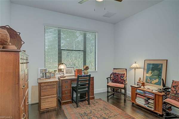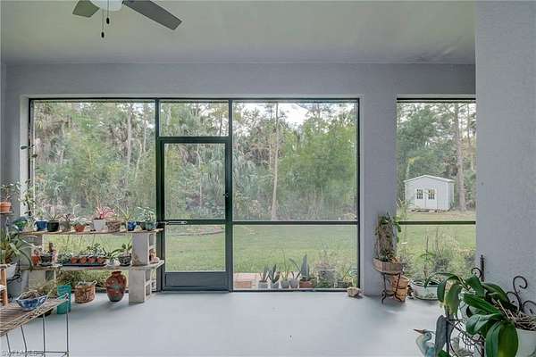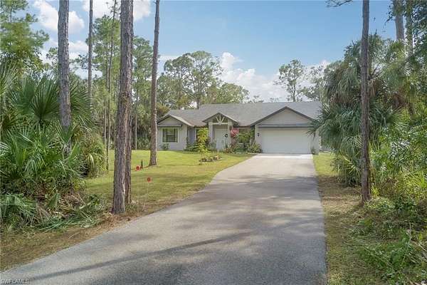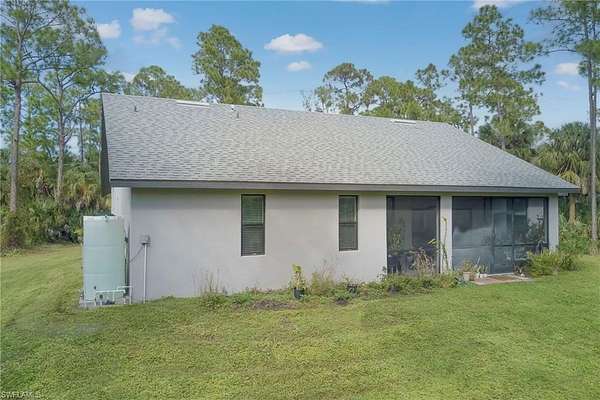 An absolute gem-priced below its recent appraisal (10/2025)! Built in 2021, this 3-bedroom plus den home sits on 2.5 acres of lush, park-like land surrounded by mature trees, fruit trees, and tropical plantings that create a peaceful, natural retreat. Tucked just off Wilson Blvd, it offers a quiet and private setting while still being close to town. Step inside to an open, light-filled layout featuring glossy marble-like flooring in the main living areas and warm wood-laminate floors in the bedrooms. The beautifully designed kitchen stands out with stainless steel appliances, gorgeous quartz countertops, custom cabinetry, and plenty of workspace-perfect for cooking, gathering, or entertaining. The primary suite includes an oversized master bathroom with dual sinks, a relaxing soaking tub, a separate walk-in shower, and eye-catching custom tilework. Across the back of the home, a freshly painted screened-in lanai invites you to unwind while taking in tranquil natural views. Additional features include a storm shutters, whole-house reverse osmosis system for pristine water throughout the home. A custom-built shed is also available for purchase outside of the contract.