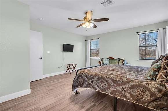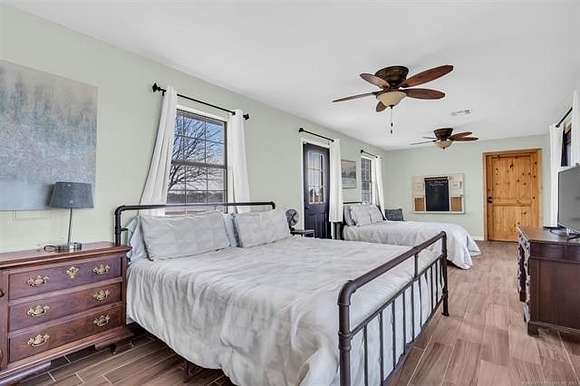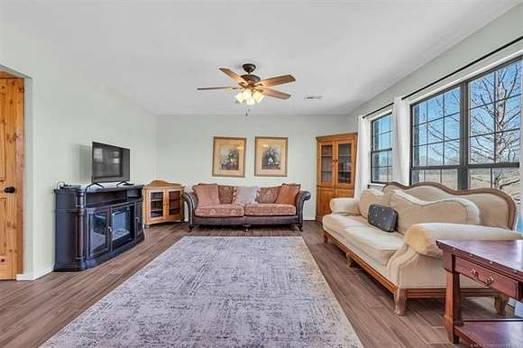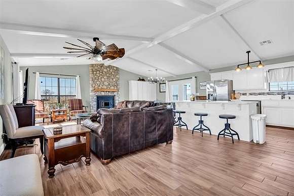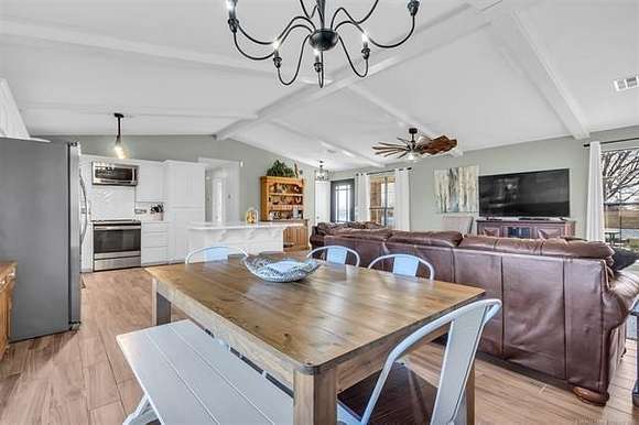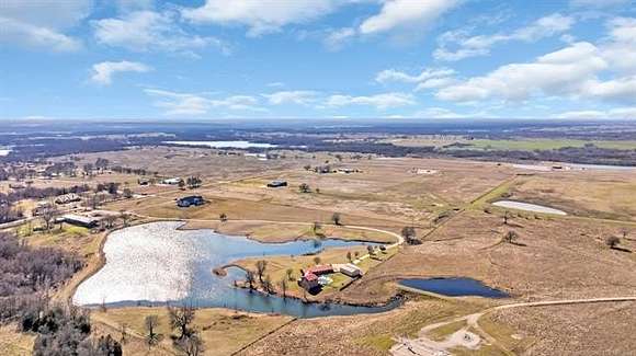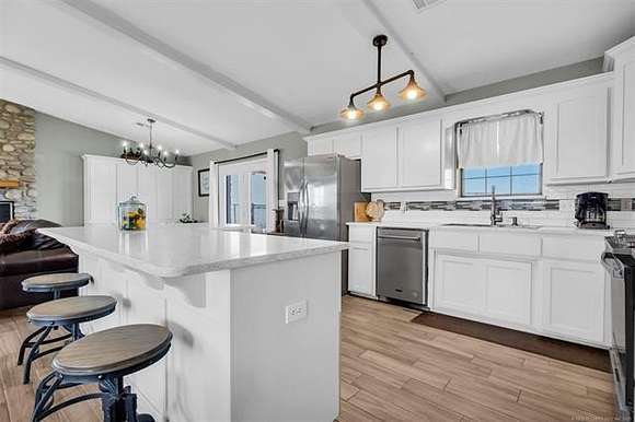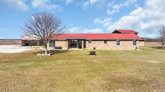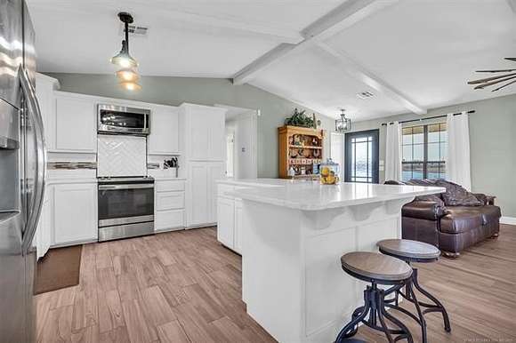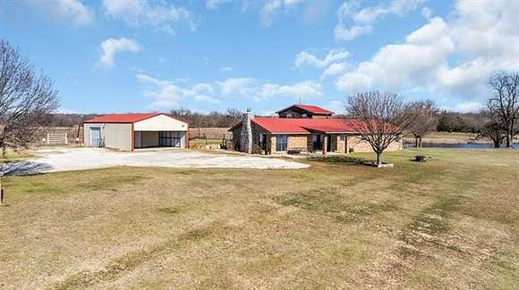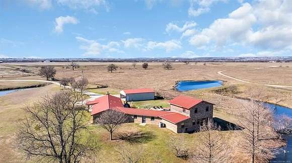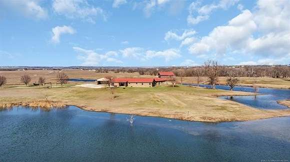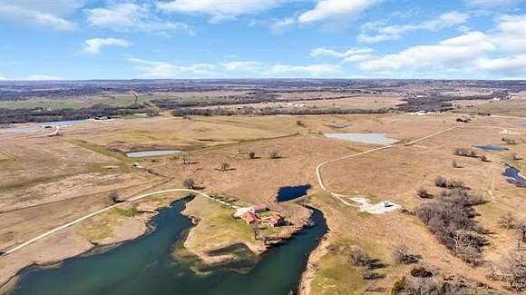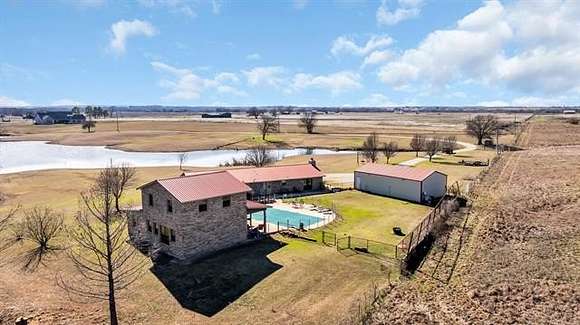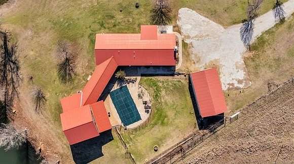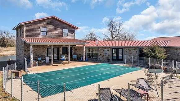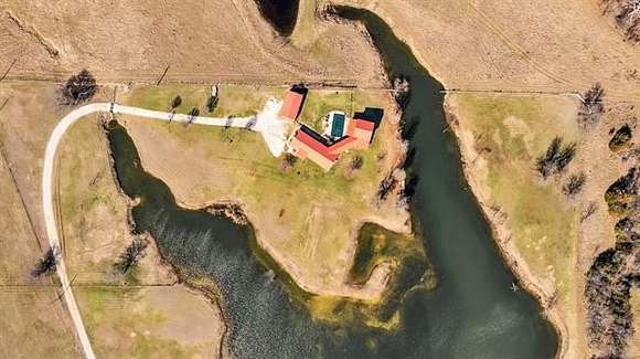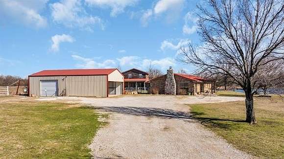 This completely remodeled property located on five scenic acres and is currently used as a commercial Airbnb property split into two sides, each featuring 3 bedrooms, 2 bathrooms, full kitchens, and living areas, and utility rooms, while overlooking a beautiful 8 1/2 -acre pond with stunning views of the Arbuckle Mountains, with access to the pond that attracts local wildlife like deer, turkey, and geese. The exterior has been enhanced with brick and rock, and the interior boasts refaced and added cabinets, new flooring, three updated tile showers, new quartz countertops, and fresh paint, along with luxurious upgrades including a whirlpool tub and tiled showers; additional amenities include an inground pool, a fenced backyard, and a shop building with covered parking, making this property ideally located near Turner Falls and Ardmore for those seeking both a country lifestyle and convenient access to local attractions, with the versatility to be used as a personal home with vacation rental potential, a large personal residence, or to continue its Airbnb operation, with all furniture negotiable. Don't miss out on this one! You've got to see it in person to truly appreciate all it has to offer