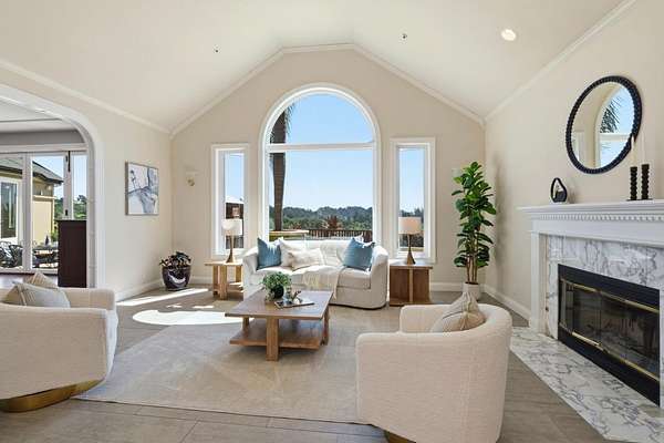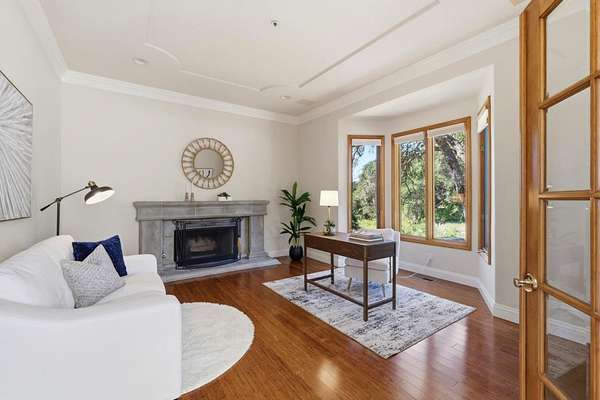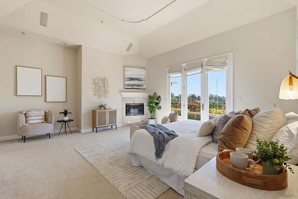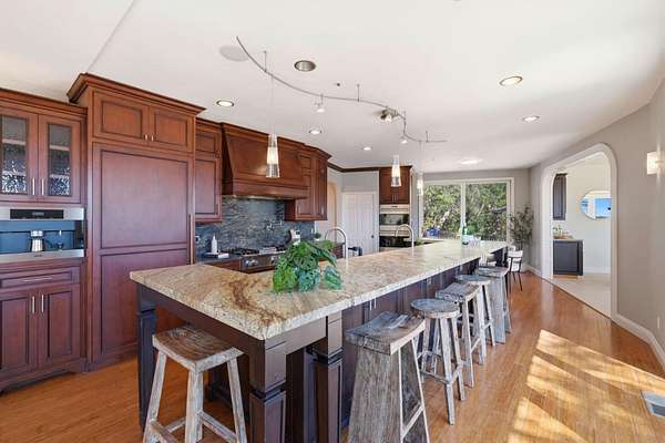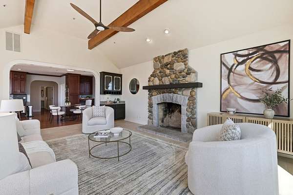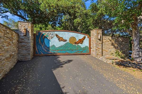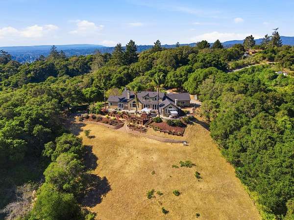 Welcome to the exclusive Mockingbird Ridge neighborhood, a stunning hilltop home with mountain views and ocean peeks. A beautifully landscaped front leads to the formal entry that opens to the living room with sweeping views, one of four cozy fireplaces. In the dining and kitchen, La Cantina doors bring the outside in. A wine bar with fridge, island for 10, and a chefs kitchen to delight any cook: 48" Viking gas range, pot filler, Wolf double ovens, 2 Fisher & Paykel dishwashers, 2 sinks with Grohe faucets, Miele fridge, built-in espresso maker, pantry, and an eat-in area. The separate family room includes a wet bar, floor-to-ceiling windows, river rock fireplace, and access to the patio with hot tub, fireplace, and garden. The ground-floor primary features high ceilings, access to the patio, and updated ensuite. Also downstairs: guest room, full bath with steam shower, office with fireplace, laundry with sink, half bath, and wine room. Upstairs are two more bedrooms and a updated double sink bathroom. New roof, Anderson windows and new exterior and interior painting. This home sits on 11+ acres, with lower property access from Race Horse Ln. Close to Seascape Resort and fwy. Zoned special use, buyers to explore possibilities: vineyard,horses, etc. Don't miss out on this one!