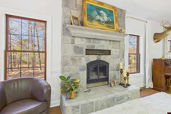 Nestled on just over seven scenic, wooded acres, this all-brick sanctuary blends modern luxury with timeless charm. Main floor highlights include a dramatic cathedral entry, oak staircase, fresh paint, and vinyl plank flooring. A chef-inspired kitchen boasts new cabinets, quartz countertops, high-end appliances, and exquisite lighting throughout. The main level features a sunlit living area, a half bath, and a fourth bedroom that doubles as a serene home office with a built-in bookcase and reading nook. The master suite offers a walk-in closet and a standalone soaking tub. An attached two-car garage complements a detached workshop plus a one-car garage. Above the garage, a studio apartment with full bath and a kitchenette--ideal for guests or in-law quarters. Over 400 sq ft of walk-in attic storage, by a very private, picturesque setting just 4 miles from ASU Mountain Home. Roof and HVAC updated in 2025. A writer's haven and nature lover's dream.